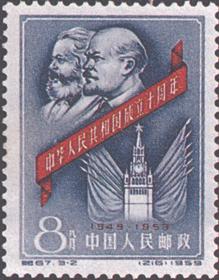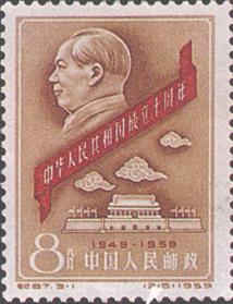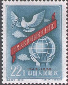 释义 | 中华人民共和国成立十周年(第一组) 发行日期:1959年9月28日 齿孔度数:11 印刷版别:影写版 图幅:25.5×35.5 全张枚数:50(10×5) 设计者:张光宇、邱陵、陈汉民、钟灵、张仃、周令钊 版图绘制者:孙传哲 印刷:北京邮票厂 (1)8分 中华人民共和国万岁、毛主席万岁 800万枚 (2)8分 马列主义万岁 800万枚 (3)22分 世界和平万岁 250万枚 (1)-(3) 3枚全 |