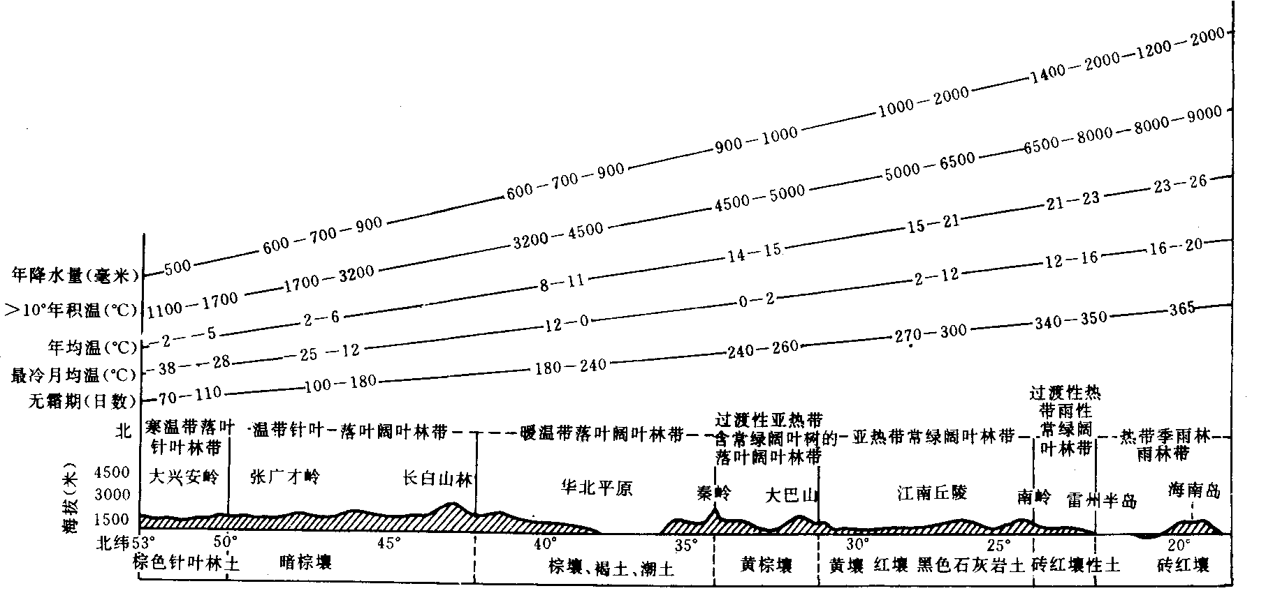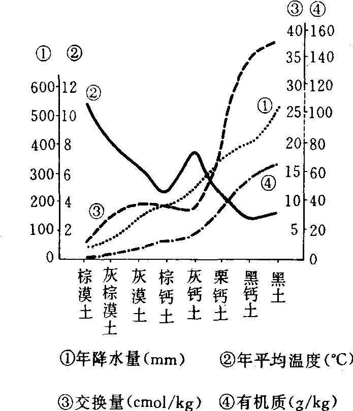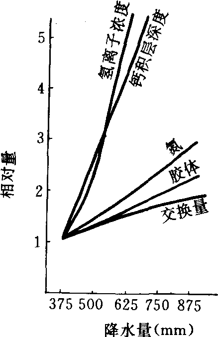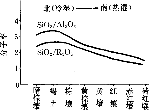 * 湿润系数=年降水量/年蒸发量减少,中国温带土壤(漠境土、钙层土和黑土)的有机质、胡敏酸/富啡酸、全氮量、C/N是随温度的升高而增加的(图1)。 ❸气候影响土壤胶体化学性质。在温带区,随着降水增多,土壤胶体含量和阳离子交换量相应增大; 但土壤pH值和盐基饱和度则降低,游离碳酸钙在土壤中的分布深度下伸(图2)。 ❹气候强烈地影响土壤风化度和淋溶度。反映土壤风化度的指标有硅铝率、硅铁率、硅铁铝率等(见风化作用)。如果土壤铝硅酸盐矿物的风化度愈强,淋溶作用愈盛,则铁、铝氧化物的残余富集愈显著; 硅铝率和硅铁铝率就愈小; 如果土壤排水好,硅铁率亦减小。中国东部湿润区土壤粘粒的硅铝率和硅铁铝率由北向南逐渐减少(图3)。反映土壤淋溶程度的指标有: 风化淋溶系数(ba值)、淋溶指数(β值)、风化指数或风化度(μ值)