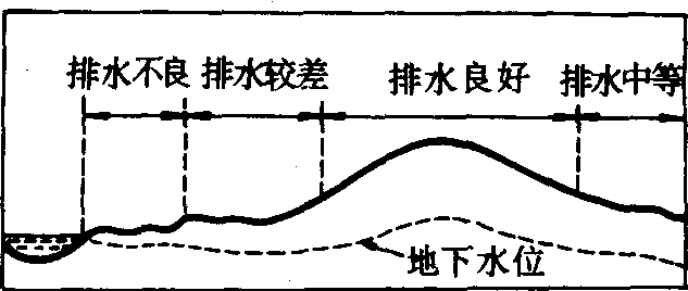 地形影响地下水位 在湿润和半湿润地区,地形起伏和地下水位是一致的; 洼地的高潜水位造成土壤过湿,还原作用强,形成沼泽土或潜育性土壤; 干旱区的浅洼地常是盐分汇集处,形成土壤盐渍化,地下水矿化度也高,丘岗地的潜水位低,土壤水除向下渗透外,还沿坡面侧向流动,可引起侧向淋溶,如东北的白浆土便是。 地形与土型及土链的关系 根据地形与水文状况及土壤发育特征的关系,苏联涅乌斯特鲁耶夫(С. С.Неуструев)及其后的伊万诺娃(Е.Н. Иванова)把相同生物气候条件下的土壤分为自型土、半水成土、水成土和冲积土。地形高亢,排水良好,地下水位在6米以下,土壤形成不受地下水影响的称自型土,它是一