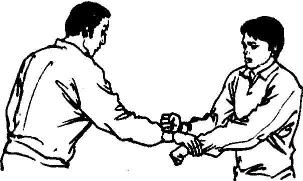 腕部解脱法。当对方以一手抓握我一侧腕关节时,我则以另一侧手猛然做下砸拳动作,截其腕关节,同时被抓握之手快速回拉,即可解脱。
