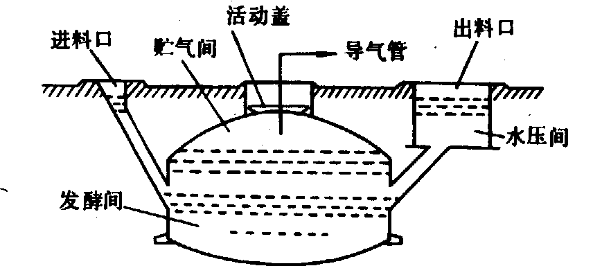 释义 | 户用沼气装置household biogas installation供家庭使用的小型产沼气设施,俗称沼气池。家庭以沼气为燃料,主要用于炊事和照明等。由于沼液和沼渣有多种用途,促进了以沼气池为中心的庭园经济的发展。国际上,户用沼气池发展数量最多的国家是中国和印度,已分别拥有约500万个和10万多个。 图1 中国水压式沼气池 浮罩式沼气池首创于印度,称为哥巴(Gobar)式,是一圆柱形敞口池,池上加一圆桶浮罩用于贮气,两侧有进出料口,结构简单。气压由浮罩重量和配重决定,基本稳定。浮罩内装有搅拌杆,旋转浮罩可破碎浮渣层,有利于产气。浮罩与池间靠料液密封,小部分料液外露,有碍卫生。这类沼气池适合于气温较高的地区。 分离浮罩式沼气池是利用浮罩贮气原理和水压式沼气池相结合的一种池型,如图2所示。由于贮气间分离,便于沼气池满装料,减少浮渣层,池容可相应减小。气压由水封的浮罩重量决定,较为稳定而且卫生。其造价高于水压式沼气池。 图2 分离浮罩式沼气池 半塑式沼气池用红泥塑料制作顶罩,池体仍是混凝土结构的沼气池,如图3所示。这种沼气池结构最为简单,无进出料口而直接揭开红泥塑料顶罩完成进、出料。属于批量进、出料沼气池。顶罩能吸收部分太阳能,有利于提高池温,但气温下降后,不利于保温。由于顶罩是柔性的,用气时,压力不稳定,需在顶罩上压以重物。这种沼气池供气时间短,红泥塑料易老化和被虫蛀。 图3 半塑式沼气池 罐式沼气池是以铁板制成,一米高的容积约为2立方米的柱形罐,一次投料后封口,属于干发酵厌氧工艺。干物质浓度可高达25%左右,加入约20%的接种物,可使用2~3个月。由于容积小,便于保温,适用于寒冷地区,但产气不均衡。 自动回流循环式沼气池,将水压式沼气池的水压间位置提高,或把水压间置于沼气池上部,由池底引一直管道与水压间相通。当沼气池产气时,一部分沼渣和沼液将由管道压入水压间。水压间向进料口倾斜,使沉淀后的一部沼渣回流,回流处可放置一U形管气封,其结构如图4所示。这种沼气池的特点是在用气压力下降时,水压间的沉渣由U形管回流进池,使沉渣中的菌种能直接接触进料,起到接种作用,从而提高了沼气池的产气率。中国南方已有多种类似池型,原理基本相同,一般都适用以纯粪便作为原料。 图4 自动回流式沼气池 为解决秸秆粪便混合出料难的矛盾,可采用两种途径:一是按两步发酵工艺进行,分别建秸秆酸化池和甲烷化池;另一种使原料全部压在沼液中,沉渣由出料口排出。 沼气池容积的确定 沼气池容积的大小首先宜根据用户需要的用气量考虑。如一个五口之家中国农户的用气量,一天约需1~1.5立方米,在常温下的沼气池产气率平均约为0.15立方米/米3·天,池容一般为8~10立方米。沼气池正常的产气量与诸多因素有关,首先要有充足的原料,即有定量的干物质(TS);适当的碳氮比(C:N),一般在15~30:1范围内均可适用;适当的干物质浓度,一般为6%~10%。浓度过高,容易酸化,应保证pH值在6~7.5范围内。池容积还由物料的滞留期确定,滞留期愈长,池容积就愈大。滞留期又和在一定温度下的发酵速度有关。粪便可按40~60天,秸草可按4~6个月考虑。沼气池的池容积可按下式计算: 上式也可在池容积确定后,算出每日所需发酵原料的总量ΣQi。 此原料的配比是否恰当,应对其总C: N进行核算,(C:N)总按下式计算: 常用发酵原料的干物质含量