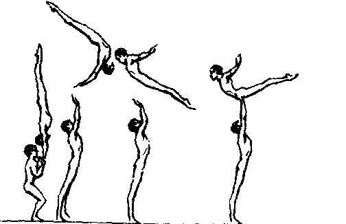 技巧混双抛接动作,双人项目基本难度之一。由“下面人”分腿立,两臂胸前屈,翻掌向上, “上面人”在其掌上成对面握倒立姿势开始,经向上推离后,“上”应即挺身前翻3/4周呈俯式落至“下”上举手上成俯平衡造型。练习过程,“上”成倒立后应顶肩紧髋,全力使身体保持直棍状态;“下”用力推起时应注意垂直向上发力。与此同时“上”积极向前上伸脚面,张开肩角,使重心稍前移。随着推离,“上”脚面下压,紧腰、振胸上立,挺身前翻。当腾空翻转过垂直部位后,“下”直臂上接,托腰侧,并稍下蹲缓冲后直立上举成俯平衡。初学时可先练习手倒立推起前翻站高垫,然后练习推起前翻托腰侧成体前跳下。配合熟练后即可直接在保护下进行练习。保护者站侧面高位,当翻转后托胸、腿帮助成俯平衡。亦可利用滑车保护带进行完整练习。