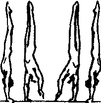 双杠项目低难度动作之一。手倒立肩向前转的倒立转体称为“手倒立正转体”,比肩向后转的反转体动作要容易些,所以应先学习正转体。该动作由手倒立开始,先将重心移至右臂上,并使身体向右前方移动,轻推左手转体90°换握右杠,两手间距离稍比肩窄些,重心再移到左臂上,轻推右手继续转体90°换握左杠,使重心平稳保持在两手之间,完成手倒立正转体180°成手倒立姿势。做该动作时常出现的毛病是:支撑臂弯曲;转体时重心移动不够;身体不直,肩有角度或过分体后屈等。初学时,应先在倒立架上练习该动作,待基本掌握后,再到双杠上练习;帮助者站在高台上,双手扶持练习者髋部,帮助转体时维持重心移动的平稳。帮助的力量,要根据练习者完成动作情况,应以让练习者体会重心移动规律为准。