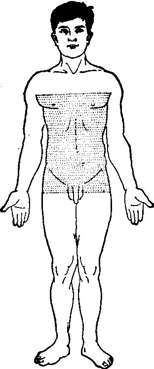 是用机械清除和化学抗菌剂杀灭手术野体表微生物的抗菌术。病人手术区的皮肤不可能都象手术者洗手一样准备,一般在清洗后应用较强烈的抗菌剂局部涂擦杀菌。病人进入手术室之前应按常规用肥皂水洗擦施行手术的部位,剃去毛发,再以乙醚去除皮肤上的油脂,涂擦70%的酒精(乙醇)消毒灭菌,最后以消毒巾包扎送入手术室。进入手术室时应换上清洁的宽大易解除的衣裤,戴帽,但一般不戴口罩,以便于进行麻醉和便于呼吸。按手术要求采取适当体位后,由第一助手进行手术区的皮肤灭菌消毒和铺无菌巾。用于手术区皮肤灭菌的药品很多,常用为2.5~3%碘酊先涂擦手术部位一次,待碘酊干后以70%酒精脱碘一、二次。涂擦有一定次序,应从中心开始,从里到外逐渐向周围扩大,已经接触外缘四周的消毒涂擦纱布不准再返回涂擦中心部; 第二次涂擦须另换纱布。但肛门口、阴道,感染病灶等部位灭菌消毒应从外到内,避免把感染菌播散。各部位手术的皮肤消毒范围也有一定规定(图)。原则上范围应当远超手术切口,一般约距切口周围15cm,以确保无细菌沾染,并可随意按手术需要临时延长或更换切口。碘酊有烧灼作用,涂擦后应以酒精脱碘,且不可用于口腔、阴道、肛门、阴囊及小儿皮肤,上述部位应改用新洁而灭、硫柳汞、酒精、红汞等消毒抗菌剂。
