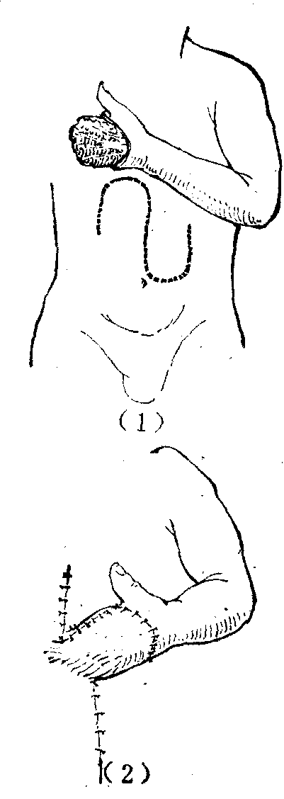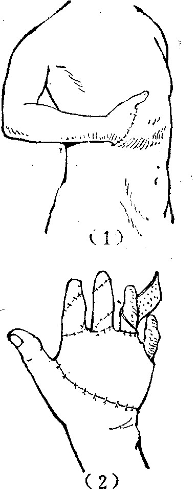 (1)手埋入腹壁皮下;(2)肉芽层形成后将手取出,移植皮片修复创面。