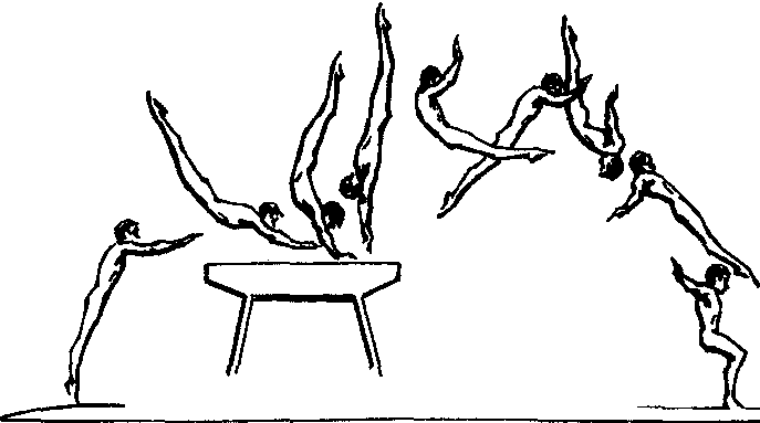 支撑跳跃高难度动作之一,推手形成的支撑反作用力,通过人体总重心的后方,使身体产生同向转动进入腾空,属手翻空翻复合型动作。运动形态特征是:前手翻推离后,在空中以直体姿势翻转一周。技术要点:起跳刚离板时,脚面发力带动下肢向上猛摆,同时两臂前伸,上体下压撑向器械,当掌根触马瞬间,急遽回腿上顶,随即突然制止,用力推离。进入腾空后起肩要快,当人体上升接近垂直部位时,两臂缩至胸前,脚面顺势后伸,并配合挺胸出髋来加速横轴翻转。当人体转成背部朝下时,两臂立即侧伸,向上梗头、起肩,随后两腿远伸,紧髋落地。当练习者掌握手翻接屈体前空翻的技术后,可进行弹簧跳板跳起直体前空翻的练习。待技术较熟练后,逐步加高垫子来加快空中翻转的速度。进而将马放置在海绵坑边(落点用海绵包加高)进行手翻直体前空翻“卧包”练习。熟练后,即可直接练习完整动作。