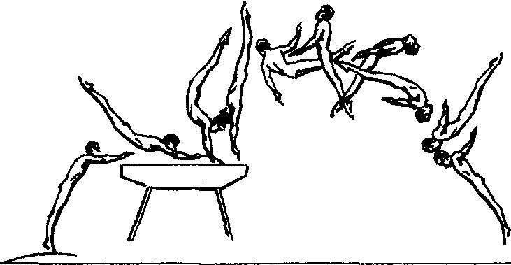 支撑跳跃高难度动作之一,推手形成的支撑反作用力,通过人体总重心的后方,使身体产生同向转动进入腾空,属手翻空翻复合型动作。运动形态特征是:前手翻推离后,在空中转体180°并完成屈体后空翻。技术要点:当手翻猛烈推离后,立即兜髋留腿,同时迅速起肩立腰并向上梗头。紧接向下放腿,配合左臂后带,头部左转进行转体。将要完成转体180°时,脚面发力带动下肢屈髋,骨盆向头上猛兜,圆背勒腿进行横轴翻转。当头部刚过垂面,立即两臂上举、立腰起肩、头部上顶做伸直动作,紧接两臂侧举挺胸紧髋准备落地。当练习者掌握了手翻转体180°团身后空翻的动作技术后,即可将横马放置在海绵坑边直接练习。当动作技术基本掌握后,可逐渐垫高落地点来缩短“二腾”的空间距离,从而进一步要求加快“二腾”中人体相对位置变化的节奏,进而提高动作质量。然后转向纵马练习。