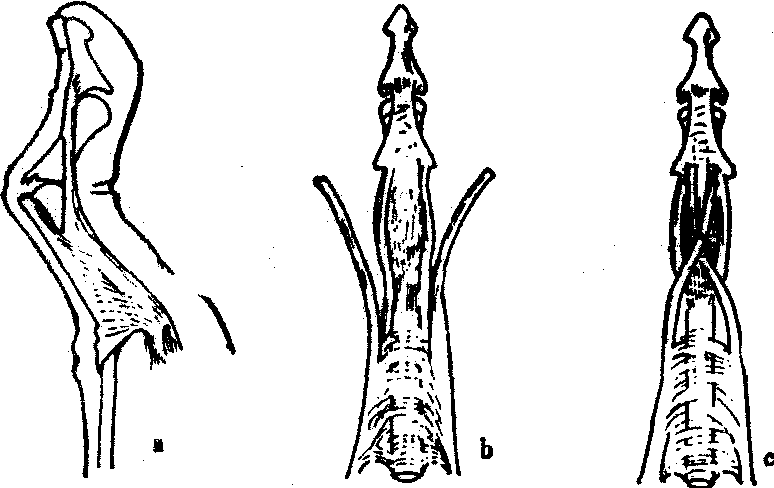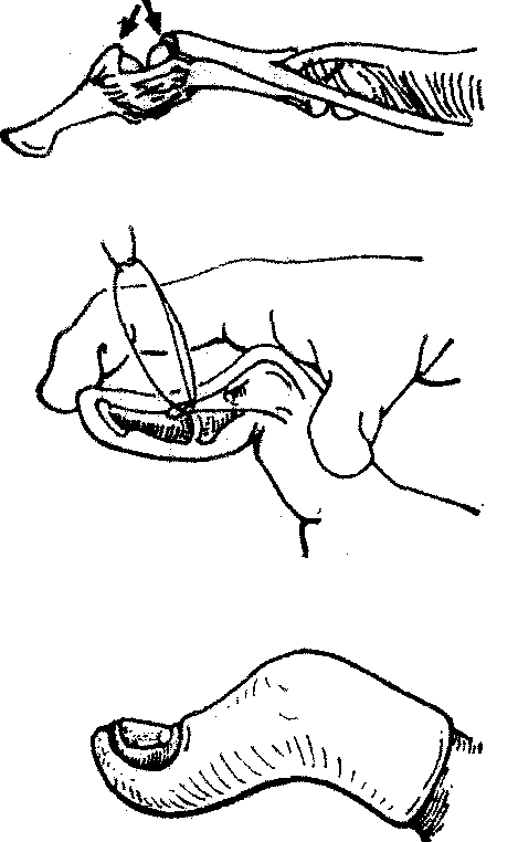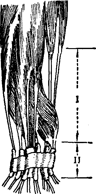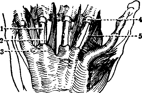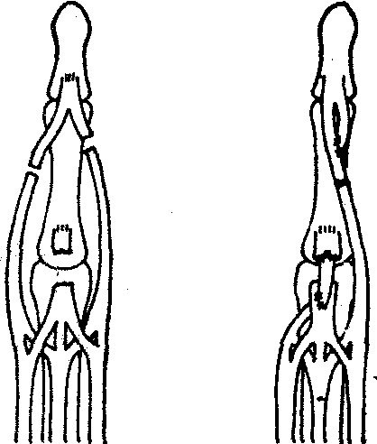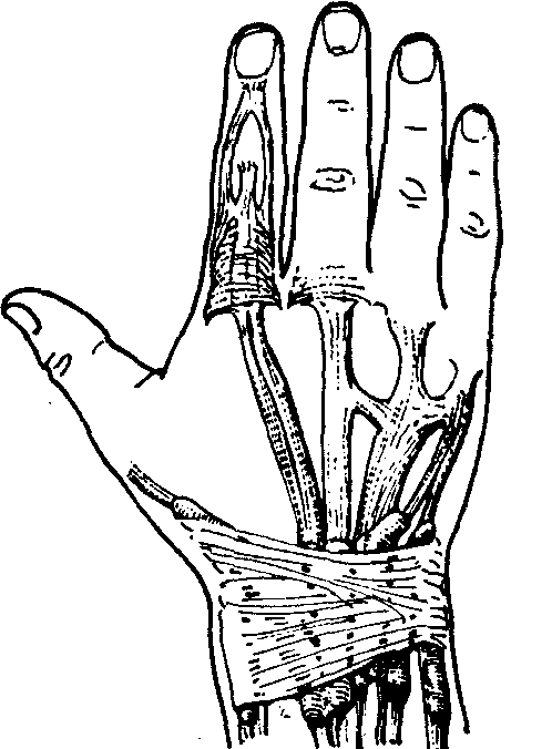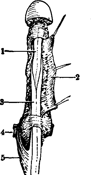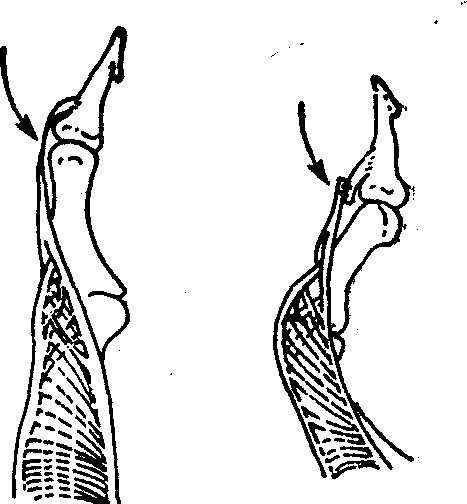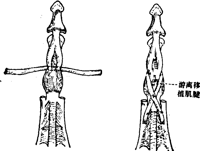 释义 | 手部肌腱损伤的处理 手部肌腱损伤的处理手部肌腱损伤后做直接缝合或肌腱移植、技术操作和移植肌腱来源,困难都不大,但要获得良好功能则不易。必须了解肌腱的创伤病理变化,修复方法,不同部位肌腱损伤的处理原则等,才能得到预期的效果。 图1 屈肌腱Ⅰ区(前臂部屈肌腱) 图2 屈肌腱Ⅱ区(腕管部屈肌腱) 1. 正中神经 2. 指浅屈肌腱 3. 指深屈肌腱 4. 腕掌横韧带 5. 拇长屈肌腱Ⅲ区 在手掌内,从腕横韧带远侧缘至远侧掌横纹即手指纤维鞘管开始处(图3)。此区域内,示、中指屈肌腱被有腱周组织,拇、小指者被有滑膜鞘,无名指者有时只有腱周组织,有时有滑膜鞘。蚓状肌起自此段的指屈深肌腱上。在此区域内,指深、浅屈肌腱断裂时,均应缝合,损伤肌腱的滑膜予以切除。同一指的深、浅肌腱缝合点位于同一水平时,可用蚓状肌包绕深肌腱,将吻合点隔开,以免粘连一起。拇长屈肌腱在此区域内断裂,也可直接缝合。 Ⅳ区 在手指纤维鞘管内,从远侧掌横纹即纤维管开始处起,至中节手指浅肌腱止点处止(图4)。此段指深、浅屈肌腱位于硬韧而狭窄的纤维鞘管内,肌腱损伤修复后极易与鞘管粘连。此区肌腱损伤,以前很多医生主张二期修复,做游离肌腱移植。但近年来多主张做早期修复。早期修复可以减少手术次数,手术切口小,也防止断腱回缩鞘管塌陷。处理可分三种: ❶在鞘管的近端,浅肌腱在浅层,单纯的浅肌腱断裂,屈指功能障碍不显著,可以不缝合。 ❷在鞘管的远端,深肌腱在浅层,单独深肌腱断裂,条件许可时,应予缝合,同时切除吻合点附近的鞘管。 ❸深、浅肌腱均断裂时,若两肌腱断处不在同一水平,可分别缝合,并适当切除一段腱鞘。若两腱断裂处在同一水平,则只缝合深肌腱,适当切除断裂的浅肌腱及腱鞘,以免与吻合的肌腱粘连。 初期手术如失败,还可进行肌腱松解或肌腱移植等手术。 拇指在此区域内只有一条拇长屈肌腱,但在掌指关节掌侧有两枚籽骨,它们之间形成一狭窄通路,拇长屈肌腱从此通过。正常的肌腱可自由滑动,肌腱断裂缝合后,膨大的缝合点则不易通过,故拇长屈肌腱在掌指关节附近断裂时,不宜直接缝合。如条件许可,早期可做肌腱延长,将断腱远段从止点处切除,将近断端前移至原止点处,以避免在籽骨附近缝合肌腱。 ![]() 图3 屈肌腱Ⅲ区(手掌部屈肌腱) 1.指浅屈肌腱 2. 指深屈肌腱 3. 尺侧滑囊 4.屈指腱鞘起始处 5. 蚓状肌![]() 图4 屈肌腱Ⅳ及Ⅴ区(手指纤维鞘管内屈肌腱) 1.指深屈肌腱 2.指纤维鞘管 3.指浅屈肌腱 4.掌骨头横韧带 5.蚓状肌Ⅴ区 在接近肌腱的止点处,即从手指中节(拇指的近节) 的中部到肌腱止点的一段(见图4)。此段肌腱虽位于腱鞘内,但只有一条指深屈肌腱或拇长屈肌腱。断裂后应早期修复,如果断裂处距止点在1cm以内,可将断腱远段切除,将近断端前移至原止点处。如断端距止点在1cm以上,则直接缝合断端并适当切除腱鞘。若失去早期修复的机会,近端已回缩较多时,可做肌腱固定或关节融合,将远侧指间关节固定在功能位,以改进伤指的功能。 指伸肌腱损伤的处理 伸指肌腱均位于皮下,只在腕背横韧带下有一段包在滑膜鞘内,其余部分均被有腱周组织。伸指肌腱各部位结构不同,修复原则分五个区域叙述。 Ⅰ区 在前臂部,从肌腱自肌肉起始处至腕背横韧带近侧缘(图5)。肌腱断裂后早期缝合。 Ⅱ区 在腕部,位腕背横韧带下,肌腱外被有滑膜鞘(图5)。肌腱断裂后应早期缝合,同时将被覆该腱的滑膜鞘及腕背横韧带部分切除,使缝合的肌腱位于皮下,以减少粘连。 Ⅲ区 在手背部,从腕背横韧带远侧缘至近节手指背的肌腱(图6)。断裂后早期缝合。掌指关节背侧伸肌腱扩展部分如有损伤,应同时修复。 ![]() 图5 伸肌腱Ⅰ及Ⅱ区(前臂部伸肌腱) 图6 伸肌腱Ⅲ、Ⅳ及Ⅴ区(手背及指背伸肌腱) Ⅳ区 在近侧指间关节背侧,伸指肌腱在此区有中央腱束及侧腱束(图6)。并有内在肌的肌腱加入侧腱束,形成一个腱帽,其中央部分与关节囊融合在一处。此处肌腱断裂,应早期修复,同时仔细检查,如关节囊、腱帽、侧腱束有损伤应一并修复。如果失去早期修复的机会,两侧腱束渐从背侧移向掌侧,近侧指间关节将呈屈曲而远侧指间关节呈伸直畸形,需行二期修复。如近侧指间关节被动伸直无限制,表明滑移向掌侧的侧腱束尚未发生挛缩,手术时探查两侧腱束也完整时,可将两侧腱束的外侧一半在指背交叉修复伸指功能(图7)。如侧腱束已短缩,需将其在不同水平切断,相互编织(图8),或用掌长肌腱游离移植(图9),以恢复伸指功能。 图7 中央腱束断裂,利用侧腱束交叉修复 a. 中央腱束断裂 b.劈开侧腱束 c.交叉缝合![]() 图8 侧腱束在不同水平切断相互编织 图9 掌长肌腱游离移植 图10 伸肌腱止点处切割伤,一期缝合及制动位置 ![]() 图11 不锈钢针固定骨折片 Ⅴ区 在止点附近,伸指肌腱在接近止点处很薄,与背侧关节囊组合在一起止在末节指骨基底背侧。整齐的切割伤,应早期缝合,术后,近侧指间关节在屈曲位,远侧指间关节在过伸位制动六周 (图10)。若为戳伤,肌腱断端撕裂不齐,有时常有小片撕脱骨折,则采取闭合疗法,将伤指制动在上述位置六周,若撕脱骨折块较大,超过关节面的1/3时,必要时应切开复位,缝合或用不锈钢针固定(图11)。晚期病例,如功能障碍明显,可做修复手术,将已断裂但有瘢痕相连的伸肌腱切开后重叠缝合(图12)。 图12 伸肌腱止点处断裂,晚