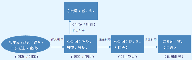 ❶喊叫;吼叫;鸣叫。不及物动词。 a.作谓语,可带补语、宾语。 鸡~了|弟弟在门外大喊大~着|小狗突然~起来|汽笛~得震耳欲聋|鸡~过三遍了|~了几声|~哑了嗓子|~不出声来了。 b.构成词组作补语,要用“得”。 他痛得~起来|我吃惊得差点儿~出声来。 ❷呼喊;召唤;招呼。能重叠。作带宾、带补谓语,可构成兼语词组作谓语。 老师~你哩!|他~了一辆出租车|你到楼上去~~他吧!|两兄弟随便~了四个菜|电话一直~不通|~了几声|嗓子都~痛了|~了很久|把他~上来|妹妹怯生生地~了一声:“老师好!”|~进去一个孩子|~上楼来|我~不动他|~不醒他,他太累了|你~他来。 ❸致使。构成兼语词组作谓语。 这场雨真~人喜欢|这可~我怎么办?|很~妈妈伤心|这件事确实~人为难。 ❹称呼。作带宾谓语,可带双宾语。 他~王方|冰川也~冰河|他的父亲~闰土|大家~她豆腐西施|人们~他“泥人张”。 被。表被动,引进动作的施动者,引进的施动者可以是人,也可以是物;构成介宾词组作状语。 我~妈妈批评了一顿|小鸡~黄鼠狼叼走了|屋子~他弄得乱七八糟|这么重要的事~他忘掉了!|周扒皮~长工们狠狠揍了一顿|我~他将了一军。 相当于“被”。直接用在动词前,表示被动。 风真大,桌上的纸全~吹跑了|小明明戴着个大口罩,脸~遮去了一大半|他出的谜语全~猜中了|河水泛滥,庄稼全~淹了。 【近】 〈动〉❶喊 吼 鸣 啼 ❷让 令 使 〈介〉被 让 给 〈助〉被