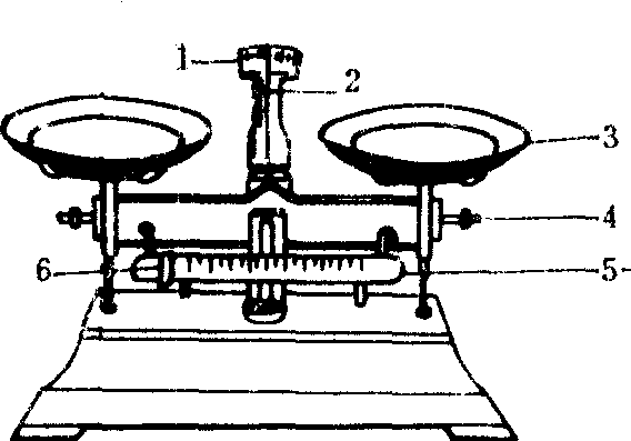 托盘天平1 标尺 2 指针 3 托盘 4 平衡螺丝5 刻度尺 6 游码