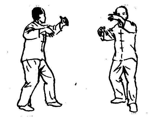 释义 | 技击桩 技击桩大成拳的主要桩功之一。动作规格:由立正姿势开始,右脚不动,右膝微屈并内扣;左脚顺脚尖方向向前迈约一脚远,以前脚掌着地,脚跟略抬起,膝微屈;上体直立,稍右转;直腰,微含胸;左臂曲肘成弧形抱于左胸前上方,手腕与鼻相对;右臂曲肘成弧形抱于右胸前,手与胸高;两手均为基本手型,头上顶,下腭微收,眼睛通过右手腕向前平视。(图2—4—83)此为左式技击桩。右式技击桩为右手、右腿在前,姿势与左势相同。动作要领:上体正直并微向左后方靠(右式向右后方靠);两大臂要抬起,两小臂要向外撑;后腿髋关节要微内收,膝关节微内扣;前腿膝关节要向前顶。意念:技击桩的意念内容很多,主要是进一步培养“浑元力”和增强攻防意识,以发掘人体的攻防潜力。适合老年人练习的技击桩意念主要有以下几种: