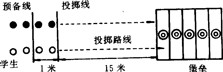 游戏方法 把参加游戏的学生分成人数相等的两个队,各成纵队站在预备线后。排头学生各持一枚手榴弹站在投掷线后,每队选一名学生负责统计成绩。教师发令后,两位排头学生依次投弹,手榴弹落到某一区内即为所得分。如打中堡垒加倍得分。第一名学生投完后,听教师拾弹口令后,捡回手榴弹交给本队第二名学生,自己站在队尾。依次进行。两队投完后,由负责记分的学生累积记分, 以积分多的队为胜。