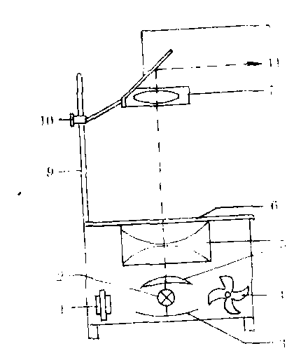 1. 电源变压器 2. 光源 3. 反光碗 4. 风扇 5. 聚光镜与螺纹透镜组 6. 载物玻璃 7. 投影放映镜头 8. 平面反射镜 9. 固定支柱 10. 调焦旋钮 11. 光线轴