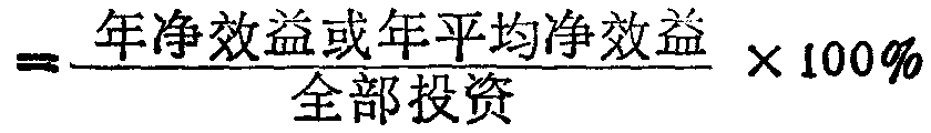 是指建设项目达到设计生产能力后的一个正常生产年份内,其年净效益与项目全部投资的比率,是反映建设项目投产后单位投资对国民经济所作的年净贡献的静态指标。对在生产期内各年度的净效益变化幅度较大的项目,应计算生产期年平均净效益与全部投资的比率,其计算式为: