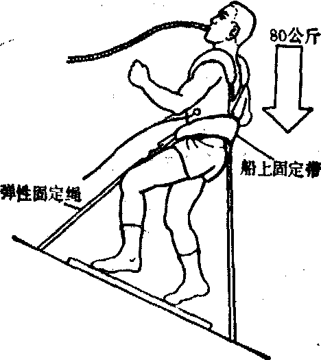 图2 跑台装置 特定的航天服也可使肌肉、骨胳系统保持一定的负荷。例如苏联礼炮号航天员穿了一种带有橡皮张力吸收器的负荷服(load suits with rubber shock absorbers),使肌肉-骨胳系统经常保持一定的紧张状态。在飞船返回前,航天员穿特制的下身加压服。可使返回地面后,血液不致过多地聚积在下身。压力梯度在踝部为85~90mmHg,到腰部为10mmHg。 下体负压 对长期卧床的人使用20~40mmHg的下体负压(将人置于特制的下体负压筒内),每天作用8小时,这种措施可使血浆容量基本不减少。它可使抗利尿激素分泌增加,排尿减少,于是保持了血浆容量。它还可增强交感神经活动,使血中儿茶酚胺含量增多。它还可防止被试者在长期卧床后立位试验时发生晕厥,并且心率增加程度减轻。在四星期卧床过程中,如果只在最后两天每天进行下体负压锻炼10小时,也有使血浆容量恢复和防止立位耐力降低的效果。现在还有人在研究自行车功率计与下体负压相结合的锻炼器的作用。近来还研究了下体负压服的作用。这种服装类似裤子,能使裤内保持负压,使失重时,血液仍能向下半身分布,以对抗失重带来的不良影响。 航天员运动后的有关数据