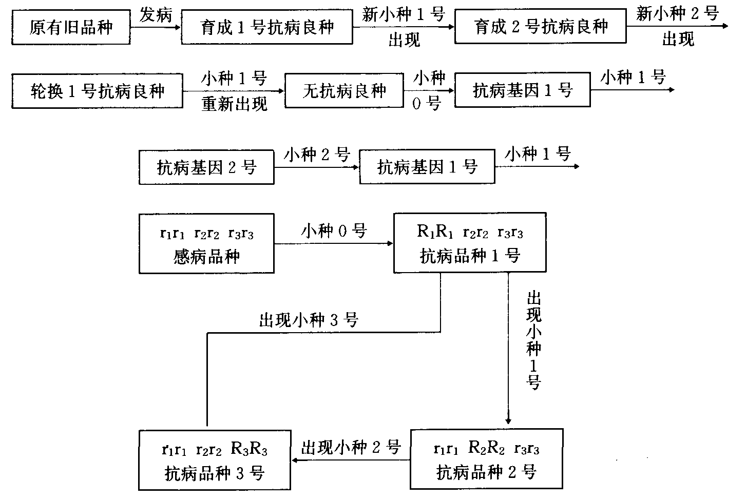 释义 | 抗病品种应用use of disease resistance variety针对由于品种单一化、遗传同质性而导致的品种抗病性丧失问题,利用抗病品种的合理布局和轮换,种植多系品种、聚合品种,达到品种多样化。利用寄主群体的遗传异质性,控制病原物群体组成的变化,以及种植水平抗性品种,保持抗病性的稳定和持久。应用耐病品种,可以减少产量损失; 避病品种虽不是应用品种本身的抗病性,但在生产上具有实用价值。 抗病品种合理轮换 根据病原物小种区系分布,在病害流行区轮换种植不同垂直抗性品种,从时间上切断新毒性小种的定向选择。1973年克里尔(Crill)提出品种轮换和基因轮换模拟图如上。 多系品种应用 针对当地生理小种组成情况,选出一套农艺性状与轮回亲本相似,而含有不同垂直抗性基因的品系,进行混合种植,以控制新毒性小种优势群体的形成和发展,延缓和推迟病害流行。当生理小种组成发生变化时,去除感染的品系,加入新的抗病品系。在多系品种内,允许有一定比例感病系存在,一般占6%~12.5%,高的可达40%。 聚合品种应用 通过复合杂交,把各种抗病基因综合到一个品种中,育成具有多个垂直抗性基因的聚合品种。聚合品种可以降低新毒性小种的适应速率,难以形成优势小种,保持垂直抗病性的稳定和持久。 |