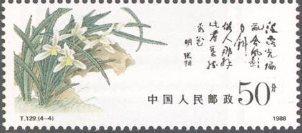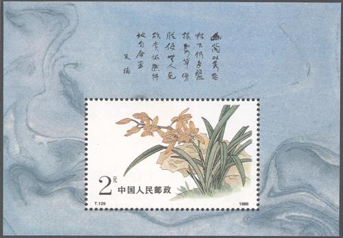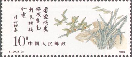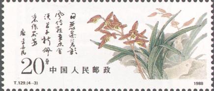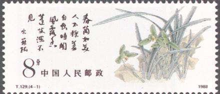 释义 | 中国兰花 发行日期:1988年12月25日 齿孔度数:11 印刷版别:胶版 票幅:60×27 全张枚数:20(5×4) 设计者:龚文桢 印刷:北京邮票厂 (1)8分 大一品 (2)10分 龙字 (3)20分 大凤尾 (4)50分 银边墨兰 (1)-(4) 4枚全 T 129M 中国兰花(小型张) Chinese Orchid(Miniature Sheet) 发行日期:1988年12月25日 齿孔度数: 印刷版别:影写版 小型张票幅:60×40 小型张面积:120×85 设计者:龚文桢 印刷:北京邮票厂 (1)2元 红莲瓣 |