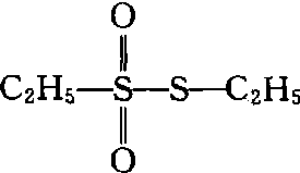 释义 | 抗菌剂402有机硫杀菌剂。化学名称:乙基硫代磺酸乙醋。化学结构式如下。原药为微黄色透明液体,挥发性强,具大蒜味,水中溶解度为1.2%,可溶于多种有机溶剂。广谱性杀菌剂,主要作种苗处理(浸种、闷种)防治水稻、棉花、大豆、山芋等种传病害,亦可土壤浇灌处理和叶面喷洒。与其他药剂混配作蚕药用。使用浓度下对植物安全,种苗处理的水稻、棉籽出苗快、壮等特点。对大鼠急性口服LD50为140 mg/kg,对皮肤有灼伤作用。 |