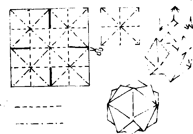 利用纸张的正反折线变化,将正方形纸收缩成多棱彩球。制作方法是,裁两张正方形纸,一大一小,大纸的面积是小纸的四倍,将大张纸对角线反折成凹线,再用四个角对中心反折四条斜线;接着横向、竖向对折方纸共折六条正折凸线;折好后对着四边中线剪开口。将小纸反折两条对角线,正折两条横纵线作成纸盖。把大纸收缩,将开口两侧对粘,把小纸盖压粘在棱球上端,作成折纸彩球。
