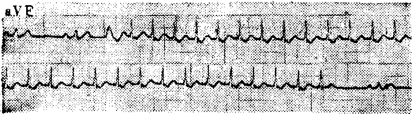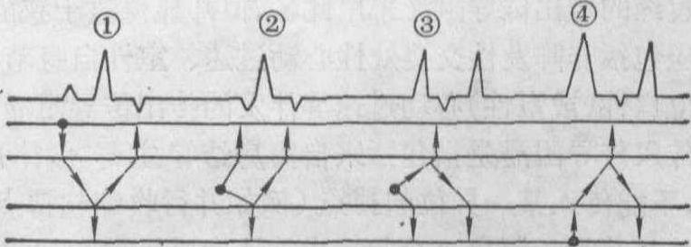 释义 | 折返现象心电图 折返现象心电图心肌纤维在恢复应激过程中,由于某种原因,如局部缺血、电解质分布不均匀等,可使复极速度不一致。当不应期有明显差别时,激动先通过已恢复应激性的那部分纤维,以后再迂回传入较晚恢复的纤维;等到激动由此返回至先应激的那部分纤维时,又因该处已脱离了不应期,就可重新应激并将兴奋波传至周围组织。这种现象称为折返现象。如单一地发生折返激动则形成早搏,并可具有固定的配对间距。如一再重新激动,发生反复不断,甚至不规则的循环折返,可引起阵发性心动过速(折返型)、扑动或颤动。这种折返现象可发生于心室内Purkinje纤维和心肌交接处形成微型折返或涉及较大的环形径路(如预激综合征的附加束)而形成环形折返。在解剖上没有环圈的情况下,邻近纤维的功能性纵行传导分离,也可造成折返。例如双重性房室传导径路,即房室交接处存在着不同程度传导抑制的两条径路。一条较轻,即不应期轻度延长;另一条较重,发生单向传导阻滞。如图1所示,由交接处起搏点发出的激动(JP),一方面下传到心室,引起一个QRS波群; 另一方面,激动缓慢地通过抑制较轻的交接处(点区)逆传到心房,产生一个逆行型P波。嗣后该激动又折返回来,通过抑制较重的交接处,即单向传导阻滞区(斜线区)再次激动心室,引起第二个QRS波群,此即反复心搏或心律。另外,束支及未分支的Purkinje纤维也是属于这一类的折返现象。折返途径的形成必需具备: 图1 反复心律产生示意图 心电图表现如下: 窦房结或心房异位激动引起的: ❶窦房结折返: 可见于人工心房起搏和房性早搏时。表现为包含房性早搏在内的前后两个P波所组成的P-P间距(P-P′-P)短于窦性心搏周期,早搏后的一次心搏是在窦房结或其周围组织内折返引起的窦性回声波。由此引起三个以上快速窦性心动,称窦房结折返性心动过速。 ❷心房内折返: 可导致房性早搏、阵发性房性心动过速、心房扑动和心房颤动。 ❸房室交接处折返: 窦性或房性激动在房室交接处折返至心房。可形成房性反复心搏(图2)。表现为P(P′)-QRS-P′序列,一般P(P′)-R往往延长;如连续发生折返则形成阵发性室上性心动过速。 图2 反复心搏的梯形图 激动起源于 房室交接处异位激动引起的: 根据房室交接处起搏点发出激动的逆传及下传速度不同,可分别形成房性或室性反复心搏(图2)。这些激动在心房与心室之间连续往返运行,则形成阵发性室上性心动过速。 心室异位激动引起的: ❶房室交接处折返: 室性起搏点发出的激动在房室交接处逆传过程中,若发生下行折返,可形成室性反复心搏(图2)。表现为QRS-P′-QRS序列。其中第一个QRS畸形宽大,第二个QRS正常,也可能伴有差异性心室内传导。这种R-R时距一般在0.40~0.50s,如连续发生折返,同样可形成阵发性室上性心动过速。 ❷心室内折返: 可形成具有固定配对间距的室性早搏和阵发性室性心动过速,甚至心室扑动和心室颤动。 反复心律通常是指来自窦房结或异位起搏点的激动发生在房室交接处的一种特殊折返现象,表现为往返逆传或下传到心房或心室形成反复心搏或心律。如连续发生一系列反复心搏,称为阵发性反复性室上性心动过速。鉴于这一类型的阵速都是凭借房室交接处的折返机制才能完成,所以也有称之为阵发性反复(或折返)性交接处性心动过速。另外,预激综合征病人常因附加束的存在而易于发生激动的环形折返,故常伴发阵发性室上性心动过速(图3)。 图3 预激综合征伴由室性早搏引起的阵发性室上性心动过速心电图(上下二行系连续描记) ☚ 差异性传导心电图 传出、传入传导阻滞心电图 ☛ |