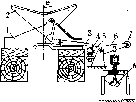 图1 偏心翻板式重力抛木机 1.承载梁; 2.翻板; 3.锁杆; 4.推杆; 5.限位螺钉; 6.平衡臂; 7.配 重; 8.电磁铁 引构件翻转,原木被抛下。承载梁在翻转过程中推压小门板而关闭并自锁。倾翻的承载梁在适当地点复位。只要在两轨道上均开设小门,即可实现双面抛木。理论和实践证明,原木自抛性能很好。不论原木直径大小、原木弯直和装载偏斜与否,都能可靠地被抛卸下去,抛木时间只需0.3~0.5秒。