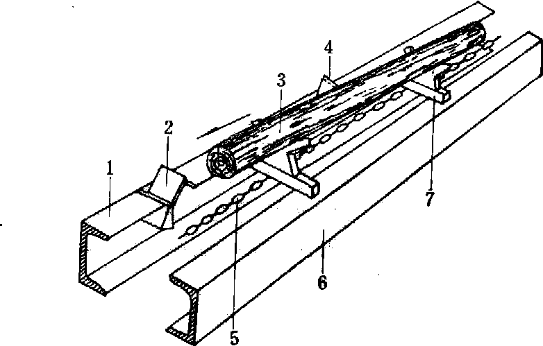 图2 翻梁式重力抛木机 1、6.轨道;2、4.小门;3.原木;5.牵引构件;7.抛木承载梁 在重力抛木机中,承载板或承载梁的翻转是靠门机构控制的。门机构有大门和小门之分。大门有推动式和压力式2种,小门有空穴式、引导式和挡铁式3种。图1为推动式大门,图2为空穴式小门。抛木机log kicker用于选材输送机或出料输送机的原木卸料装置。抛木机可以直接控制或遥控,在输送机中间或末端卸料。分为两类: ❶动力式。以电动机或空气压缩机的气源为动力,利用抛木杆,撞击原木,实现抛卸;或在输送机的卸料处设置一块挡板,利用输送机的运动能量,实现抛卸原木。 ❷重力式。以铰接在横梁的翻板为原木承载装置,利用电磁铁和拉杆操纵输送机卸料处设置在运行轨道上的一扇活门,当开启活门时,承载装置失去平衡,原木便抛卸出来。动力式抛木机的输送机驱动功率小,但需增加抛木驱动装置。重力式抛木机不需要增加抛木驱动装置,但输送机的承载装置结构复杂,牵引构件的负荷增加,输送机功率消耗大。 |