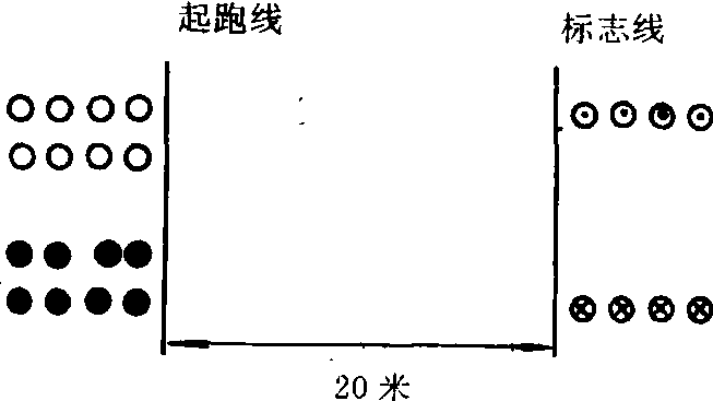 场地 在操场或空地上画两条相距20米的平行线, 一条为起点线, 一条为标志线。