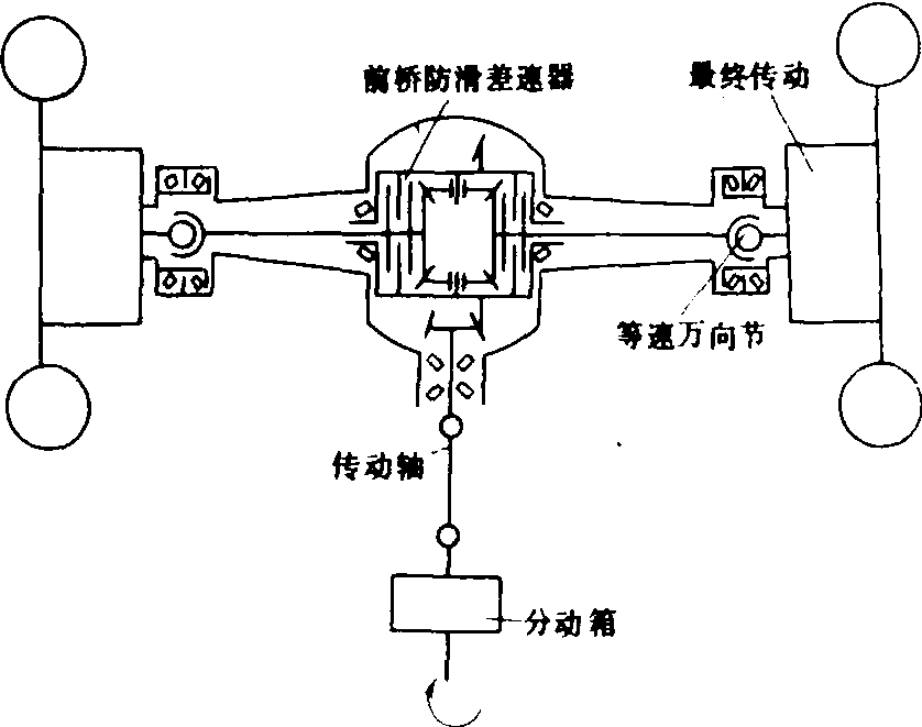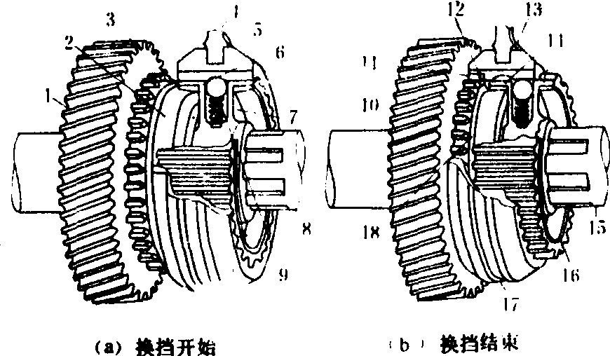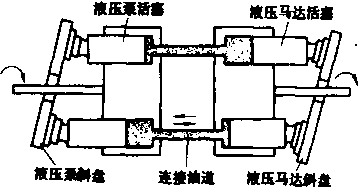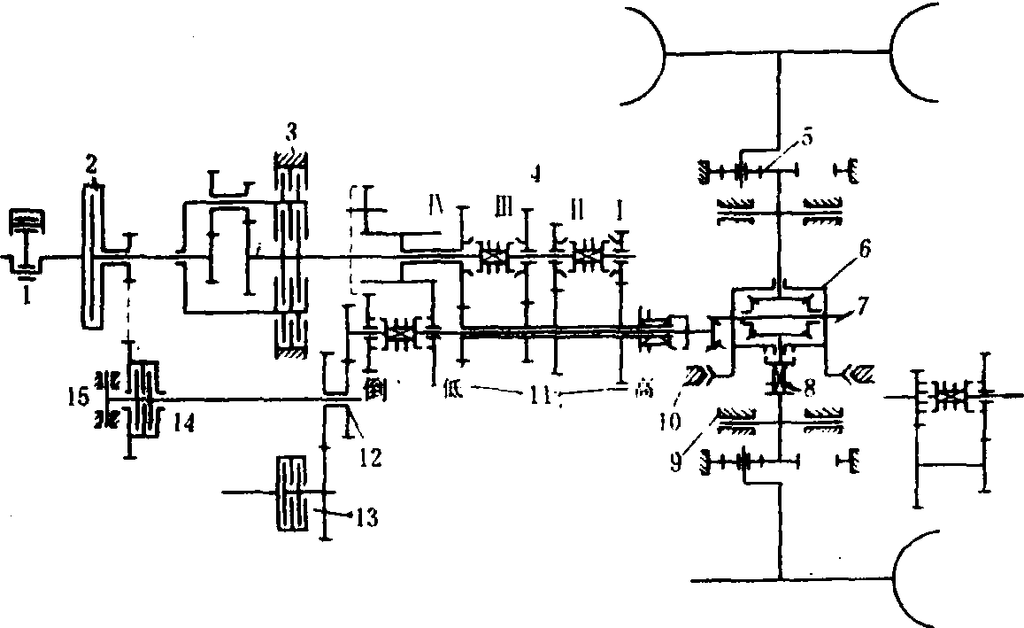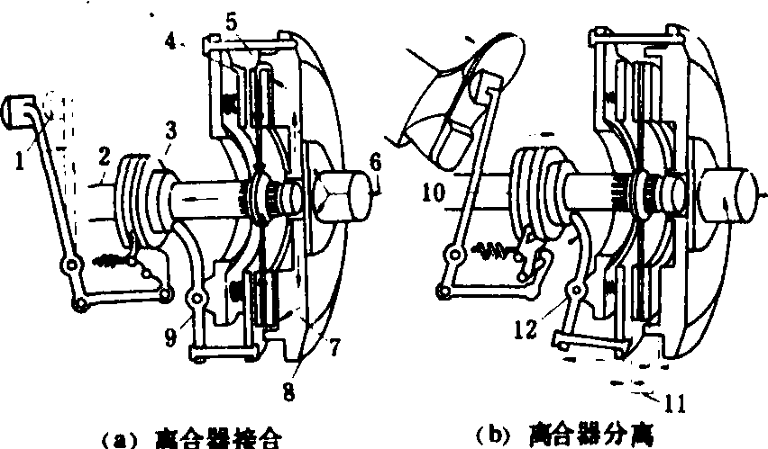释义 | 拖拉机传动系统transmission system of tractor将发动机的转速、扭矩经变换与控制,传给拖拉机驱动轮及动力输出轴的一系列装置。包括离合器、变速箱、后桥及动力输出轴传动。在四轮驱动拖拉机上增设分动箱、传动轴及前驱动桥。图1为轮式拖拉机传动系统简图。 图1 轮式拖拉机传动系统 1.发动机;2.主离合器;3.动力换档快/慢;4.主变速;5.最终传动;6.中央传动与差速器;7.动力输出轴;8.差速锁;9.行车制动器;10.停车制动器;11.组成式变速箱; 12.分动箱;13.前桥驱动离合器;14.动力输出轴离合器;15.动力输出轴制动器 离合器 用于传递和切断发动机传给主传动系统及动力输出轴的动力,以便于换档、平顺起步、停车及操纵农机具的驱动,同时防止传动系统过载。拖拉机普遍采用摩擦式离合器(图2)。 摩擦式离合器作用原理如下:当压紧力(一般是弹簧力)通过压盘把从动盘与飞轮压紧时,发动机动力则通过飞轮、压盘与从动盘间的摩擦力传递给变速箱输入轴[图2(a)]。当离合器分离机构把压盘的压紧力撤去时,离合器则分离,发动机传递给变速箱的动力被切断[图2(b)]。在离合器接合过程中,控制压盘的压紧力,使其缓慢增加,摩擦力也缓慢增加,离合器从动盘相对于飞轮滑磨,变速箱输入轴转速缓慢上升,达到平顺起步的要求。 离合器在接合过程中由于滑磨产生大量的热,使摩擦衬面温度升高,因而对摩擦片不但要求有较高的摩擦系数,还要有足够的耐热性能与抗磨性能。干式离合器摩擦衬面常用胶压石棉或金属陶瓷摩擦材料,一般用弹簧压紧。湿式离合器用粉末冶金或纸质摩擦材料,一般用液压压紧。 图2 摩擦式离合器 1.自由行程; 2.变速箱输入轴; 3、10.离合器分离机构; 4.压盘; 5.从动盘; 6.动力从发动机输入; 7.动力传递; 8.飞轮; 9、12. 离合器分离杠杆; 11.间隙 变速箱 为适应各种作业中不同的速度与工作负荷的需要,在传动系统中设置变速箱,提供多种速比(档次),便于使用中选择。拖拉机变速箱分有级和无级两类: 有级变速箱 一般利用齿轮在花键轴上滑动,使齿轮啮合或脱开以进行换档。这种变速箱结构简单,成本低,但换档不够轻便,由于换档时进入啮合的齿轮其圆周速度不同,会发生换档冲击,齿端部易磨损。为此可采用:❶啮合套换档。不同档位常啮合齿轮利用啮合套使齿轮与花键轴接合或脱开以进行换档,啮合套换档较轻便,但仍有换档冲击。 ❷同步器换档。不同档位的常啮合齿轮用同步器代替简单啮合套换档(图3),换档时,同步器同步元件(内、外锥)间产生的摩擦力矩使啮合套与将接合的齿轮转速相等,最后啮合套与接合齿接合,实现无冲击换档。 ❸动力换档。不同档位的常啮合齿轮利用液压控制的离合器或制动器换档,可实现负载下换档(见拖拉机动力换档)。 图3 同步器换档 1、10.齿轮; 2、18.外锥; 3.外锥与内锥接触; 4、13.拨叉; 5、17.啮合套; 6、14.内锥; 7、16.齿座; 8、15.输入轴; 9.弹簧压紧钢球在啮合套槽中; 11.啮合套与接合齿接触; 12.弹簧压紧钢球从啮合套槽中滑出 为了简化结构,变速箱普遍采用组成式结构。如图1中的组成式变速箱具有8个前进档、4个倒档。主变速具有4个档,副变速包括高、低档及倒档。主、副变速均用啮合套换档,某些变速箱的主变速采用同步器,以方便换档。 无级变速箱 应用动液力传动与静液压传动实现无级变速,在理论上可使发动机的功率得到最充分利用,但动液力传动效率较低,输出转速不稳定。农业拖拉机工作载荷相对比较稳定,很少采用动液力传动。工业拖拉机由于载荷变化较大,能充分利用动液力传动自动变速的优点,使用比较广泛。静液压传动具有布置方便,变速范围宽等优点,但传动效率也较低,仅在传递功率不大,功率损失不是重要考虑因素,速度控制要求精确而又需变速方便的情况下采用。 图4 液力变矩器 动液力传动 其核心部件是液力变矩器(图4)。在闭合的循环通道内布置泵轮、涡轮及反应轮,发动机驱动泵轮,泵轮叶片使油液高速转动,发动机的机械能转换成液体的动能,高速转动的油液冲入涡轮,使涡轮转动,液体动能转换成机械能,涡轮与变速箱输入轴联接,输出扭矩。从涡轮出来的油液经反应轮流回到泵轮,反应轮固定不转动,它承受反作用扭矩,使涡轮的扭矩大于泵轮的扭矩。 动液力传动具有自动变速作用,随外界负载增大,涡轮转速降低而扭矩增大。但液力变矩器最大变矩比一般不超过5,另外其高效区(效率大于80%)比较窄,通常液力变矩器与有级变速箱组成液力机械传动。 静液压传动 发动机驱动液压泵,液压泵把发动机机械能转换成液体的压力能,压力能驱动液压马达,使液压能转换成机械能,液压马达通过减速齿轮或直接和驱动轮相连,通过改变斜盘的倾斜度改变泵与马达的排量比,进行无级变速(图5)。 差速器 轮式拖拉机的后桥中设置有差速器。在拖拉机转向时,行星轮绕行星轮轴转动,使外侧驱动轮的转速大于内侧驱动轮的转速以适应两者转弯半径不同。 普通差速器的内摩擦力矩较小,左、右半轴齿轮驱动扭矩差值不大,当一侧驱动轮附着力减小而打滑时,拖拉机牵引能力迅速降低,为克服此缺点,通常采用差速锁或防滑差速器。差速锁是用人工操作的啮合套、牙嵌离合器或差速锁离合器。它或使左、右半轴齿轮联锁,或使半轴齿轮与差速器壳体联锁。这样左、右半轴齿轮与差速器壳体以同一转速转动。转