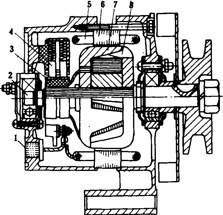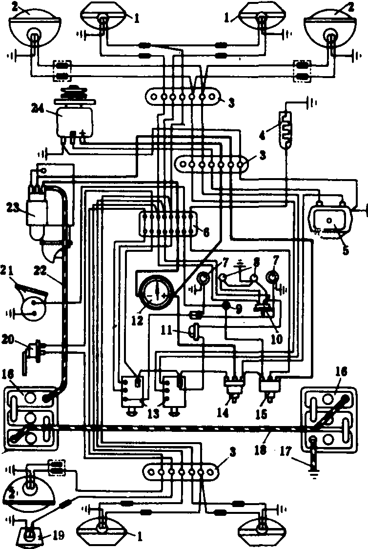 释义 | 拖拉机电器仪表系统electrical appliance and instrument system for tractor保证拖拉机正常工作所需的各种电机、仪表及电器装置。通常包括蓄电池、发电机(包括电压调节器)、启动电动机、照明系统、开关及仪表信号报警系统等。 图1 硅整流发电机 1.硅二极管;2.轴;3.集电环;4.电刷;5.定子线圈;6.定子;7.磁极;8.激磁线圈 启动电动机 是一种串激或复激的直流电动机。工作时电磁铁使其驱动齿轮与发动机飞轮齿圈啮合而启动发动机。当发动机启动后转速升高,单向离合器使驱动齿轮在轴上空转退出啮合。为了减小体积适合小缸径发动机配套,采用带有减速装置的高速启动电动机。 图2 拖拉机电器线路 1.小灯; 2.大灯; 3.接线板; 4.预热塞; 5.调节器;6.保险丝盒; 7.仪表灯; 8.转向信号灯; 9.喇叭按钮;10.转向灯开关; 11.闪烁断续器; 12.电流表; 13.双档开关; 14.电门开关; 15.预热启动开关; 16.蓄电池; 17.蓄电池搭铁线; 18.蓄电池间连线; 19.刹车灯; 20.刹车灯开关; 21.喇叭; 22.蓄电池至启动机连线; 23.串激式直流电动机; 24.硅整流发电机 照明系统 拖拉机一般有前灯、转向灯、刹车灯、仪表灯、工作灯等。各灯具在照明区的照度都有一定要求。有的拖拉机尚有慢速车辆警告灯、尾灯、示廓灯、驾驶室顶灯等。 仪表及信号报警系统 由指示仪表、闪光灯、信号灯及传感器等组成。常用的仪表有水温表、机油压力表、电流表、速度表、燃油油量表、工作小时计等。仪表的型式有弹簧管式、热电式、磁电式等。现代拖拉机常采用磁电式组合仪表,配温度、压力、真空度、转速、油量等各种传感器。传感器的结构有模拟量类和开关量类两种,模拟量类传感器和指示仪表相配;开关量类传感器与报警信号灯配合,作超限报警。开关量类传感器常用于油压及空气滤清器堵塞,机油和柴油滤清器堵塞等。闪光灯用来提供转向和报警信号。还有一些信号灯用来指示拖拉机工作状况,如停车制动器是否放松;前轮驱动是否挂档;蓄电池是否充电;动力输出轴转速是540转/分还是1 000转/分,以及挂车转向灯的使用。 拖拉机转速表有机械传动式和电子式两种,电子转速表实际上是一个广角毫安表,电磁转速传感器发生脉冲信号,经电路变换为正比于转速的电流信号送入毫安表。在转速表上常常标注行驶速度和动力输出轴转速。这种表没有传动机械磨损,因而获得广泛应用。工作小时计累计拖拉机工作时间,一般安装在转速表内。 随着电子技术的发展,在一些现代大功率拖拉机上已装有微处理机的仪表及检测系统,具有数字显示、闪光报警、音响报警以及自动检测的功能,以减轻驾驶员的劳动。 图2是一种典型拖拉机的电器线路原理图,除电流表以外,其余的仪表及传感器未画出。 拖拉机电器仪表系统electrical instrument system of tractor拖拉机的重要组成部分之一。由电源、用电设备、配电部分及点火系统等组成。电源分交、直流两类。前者为交流发电机;后者由直流发电机或硅整流发电机、蓄电池及调节器等组成。用电设备包括起动电动机、照明设备、电喇叭、电器仪表(水温表、油温表、油压表、电流表等)及指示信号等。配电部分包括开关、保险装置和导线等。点火系统有蓄电池点火和磁电机点火两类。前者由点火线圈、配电盘及火花塞等组成;后者由火花塞及磁电机等组成。 |