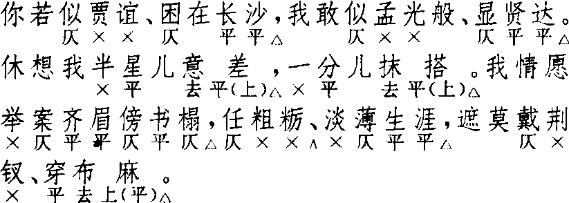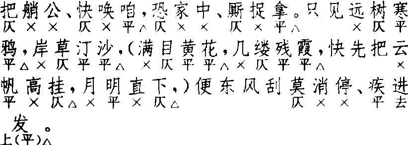 | 释义 | 拙鲁速 拙鲁速郑德辉 《倩女离魂》 ![]() 全曲七句:6△,6△。4△,4△。7△,7△,6△。首二句改五字句,如杨景贤《西游记》第十六出。第六句藏韵,不藏韵者仅见《西游记》第十六出。第四句下增四字二句,如王实甫《丽春堂》。末句后增六字折腰句一句,如郑德辉《周公摄政》。减第三句如关汉卿《哭香囊》残曲。尚仲贤《柳毅传书》、杨景贤《西游记》三套,〔拙鲁速〕前皆不用〔绵搭絮〕。 幺篇 增句 前人 ![]() 全曲五句:6△,6△。4△,4△,6△。幺篇与前篇不同之处,在第四句下改为增句,增句以四字句为主(仅见六字折腰句一例),不拘多少,句句叶韵,平仄均可。增一句者如孔文卿《东窗事犯》;增二句者,如《西游记》第十六出、《东墙记》二剧;增四、五句者较多;增六句者如《丽春堂》;《西游记》第十二出增七句,前后各增四字句二句,中夹六字折腰句三句。幺篇可用可不用。幺篇前不用前篇时亦可径题〔拙鲁速〕,如《调风月》、《贬黄州》、《西游记》第十二出;幺篇连用两支时第一支题〔拙鲁速〕者,如《东窗事犯》、《西厢记》“玉宇无尘”折、《西游记》第二十三出。〔绵搭絮〕、〔拙鲁速〕无论连用或单用,皆用在尾声之前。郑德辉《月夜闻筝》残曲,《北曲新谱》认为原题〔绵搭絮〕为〔东原乐〕误题,其〔拙鲁速〕“是否文字有脱误,或误题调名”,已“无可考定”。 ☚ 绵搭絮 收尾 ☛ |