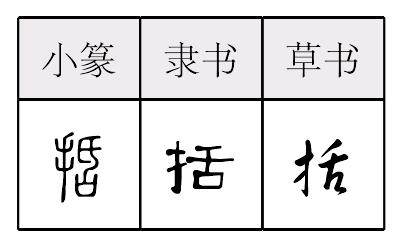 kuò形声,小篆从手, (ɡuā)声,隶定为“括”。本义为扎束,引申为包含。 【辨析】 台湾读ɡuā。括〈动〉同“刮”。 (1) 刮削;刮磨。 《醒》九七: [素姐等]立逼着狄希陈叫他在外面借了几根杉木条,寻得粗绳,~得画板,扎起大高的一架秋千。 (2) 碰;碰伤。 《醒》三二: 你拦着街撒泼,我怕~着你,叫你顺顺,我没冲撞你甚么。 (3) 搜求;搜刮。 《醒》十七: 再加贪墨之夫吸民之髓,~地之皮,在皇上辇毂之下敢于恣赃以逞。又三一: 未及新陈交禅之期,殚精竭虑,细~穷搜,拮据又延一月。 (4) 见〖刮〗❶。 (5) (风)吹。 《醒》十七: 只指望这一会子怎么得一阵大风,像~那梁灏夫人的一般,把那邢皋门从淅川县~来才好。又二七: 只见那两个鬼一阵旋风~到船上。 另见ɡuō。