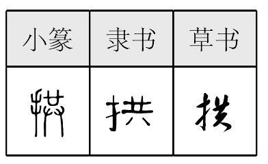 ❹ 高居深拱|墓木已拱 拱 金文; 篆gǒng[扌(手,意符)+共(聲符)→拱(《説文》:“拱,斂手也。從手,共聲。”拱,兩手合抱使臂呈弧形。身體彎成弧形〈拱腰〉。呈弧形之物〈拱橋〉。又排開它物而出〈拱出〉。通“共”。)] [西漢] 司馬遷《史記·秦始皇本紀》:“於是秦人拱手而取河西之外。” 拱*gǒng(9画)