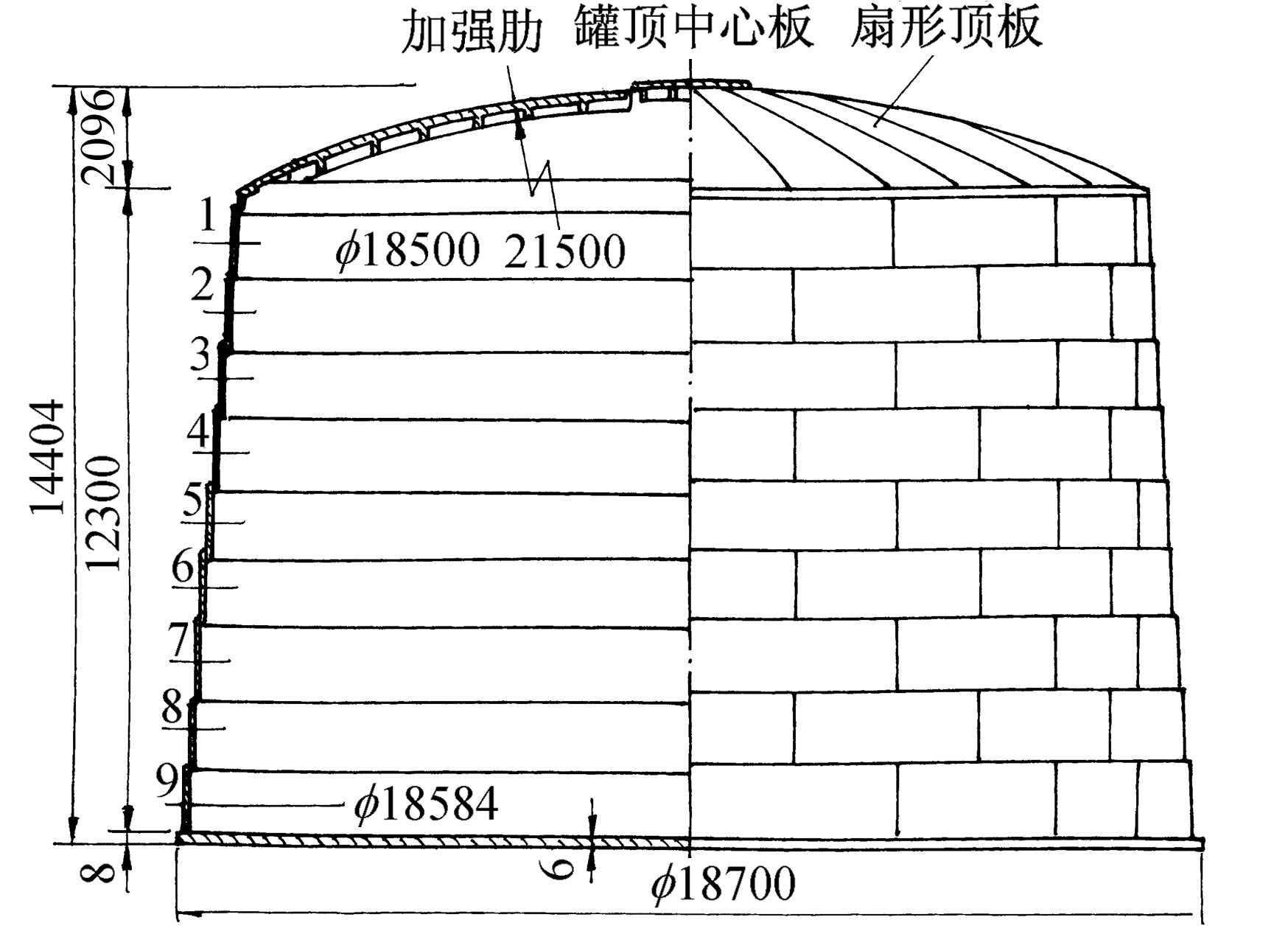 罐顶为球缺形的“立式圆柱形油罐”。罐顶由中心板、扇形顶板和壁板的角钢加强环组成。顶板厚度常为4~6mm。油罐直径大于15m时,顶板内侧焊有肋板,以提高顶的稳定性。最大装油高度不宜超过加强环,否则拱脚处受力情况恶化,降低油罐的使用寿命。储油罐容量和直径过大时,拱顶矢高增加,使单位储油量耗用钢材增多。一般认为:拱顶油罐最经济的罐容为10000m3。拱顶油罐内存在气体空间,由于环境温度变化和油罐的装卸作业,罐内气体忽而膨胀忽而被压缩,必须通过呼吸阀自动泄放油蒸气或吸入空气,使罐内压力保持在油罐承压范围内(参见“立式圆柱形油罐”),这样就造成油品的蒸发损耗,可采用消除气体空间的浮顶油罐减少油品损耗。