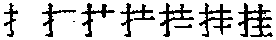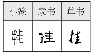 挂 ☚ 捕 拕 ☛ 挂掛罣guà古代形声字。从扌(手),圭声。韵变如圭卦娃佳例。古音圭与挂韵母都近ai,所以通转。本有区分义,中古引申为“悬义”。如:挂图。组词如:悬挂。又造“掛”字,可能“卜”从竖从点也象挂物状。又引申为牵连着。如:挂念|挂虑。组词如:牵挂。中古从这个意义又造“罣”字,上从网,以为网有牵连义。现在这两个后造字都作为异体字。见《异体字表》。又引申有登记义。如:挂号|挂失。又引申为量词,多指成串的东西。如:一挂鞭|一挂珠子。 挂掛★异◎常★常◎次