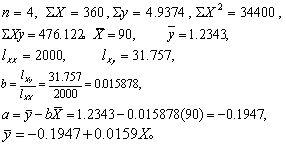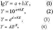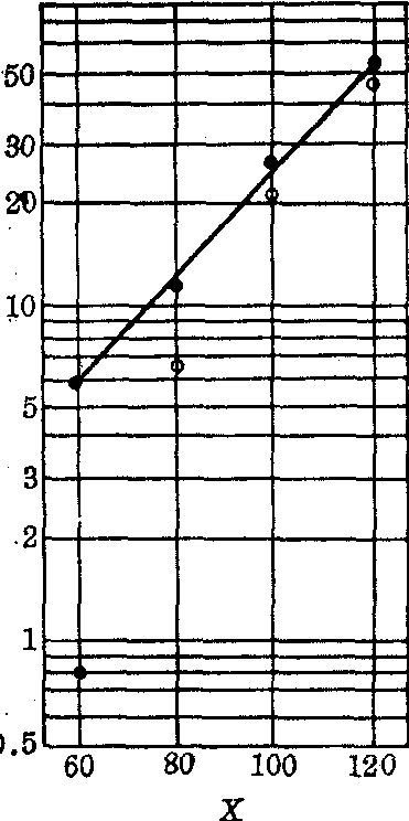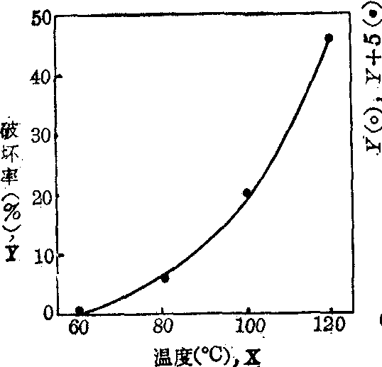 图1 八型指数曲线 最小二乘法 步骤如下: (1)将资料在方格坐标纸上绘散点图,并从图1选出与观察点趋势相似的方程形式。 (2)直线化。按方程的形式所示,将资料在半对数纸上绘散点图。若点子不呈直线趋势,则在取对数的每个变量值上加K或减K,再作散点图。给定不同的K值,如此反复尝试,直到点子的直线趋势最好,即得最适当的K值。 (3) 求方程。将资料按X与Y成对列出; 再按选定的方程形式及直线化时所得K值,将变量值作相应变换;用变换值以最小二乘法求直线方程,并写成对数或指数形式。 (4) 求Y值。以适当的X值代入所得方程求Y值。(5)作图。 以各(X、 Ŷ)值作点,用曲线板将各点连成光滑的曲线。曲线与各观察点的纵向距离近,表示拟合得好。必要时作曲线的拟合优度检验。 目测法 按资料性质,曲线必须通过某定点时; 或在直线化过程中若资料的大部分观察点的直线趋势已较明显,但有的观察点却有较大偏离,用改变K值难以进一步提高效果时,可采用目测法拟合曲线。即在上述第(2)步的基础上,直接在半对数纸上根据观察点作一目测直线,然后在线上任选两个距离较远而又便于读数的点子,用两点式建立直线方程。设两点坐标为(X1,Y1)和(X2,Y2),代入式(5),化简得直线方程,即曲线方程的对数式。 例1 以不同温度X对醋柳果汁加温3小时,测其维生素P的破坏百分比Y,结果见表1第(1)、(2)栏,试拟合指数曲线。 表1 拟合指数曲线(最小二乘法)