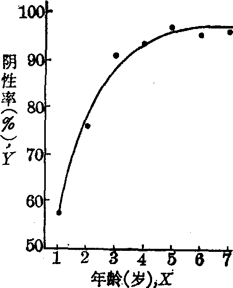 绘散点图见图2各观察点,对照图1,观察点呈图1Ⅰ型指数曲线形状,其方程形式为 lgY=a+bX, 因此Y取对数尺度,X取算术尺度,在半对数纸上绘散点图,得图3圈点。圈点尚未呈直线趋势,试取Y+5再绘图,得图3黑点,呈很好的直线趋势,故K=5。于是,按表1第(1)、(4)栏,各对X与y=lg(Y+5),用最小二乘法求直线回归方程。 图2 表1数据拟合指数曲线 图3 图2观察点的直线化 此方程的对数形式为 lg(Ŷ+5)=-0.1947+0.0159X, 其指数形式为Ŷ=10-0.1947+0.0159x-5,或 Ŷ= 0.6387(1.03729)x-5。 将X=60,80,100,120分别代入上式, 得各Ŷ,见表1第(5)栏。 以各(X,Ŷ)值绘点,连成曲线即图2的曲线。例2 某地1963年调查得儿童年龄(岁)X,与锡克试验阴性率(%)Y的数据见表2第(1)、(2)栏,试拟合指数曲线。 表2 拟合指数曲线(目测法)