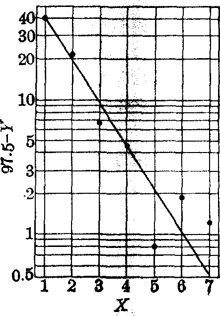 绘散点图,见图4各观察点,与图1 Ⅳ型曲线形状相似,其方程形式为 lg(K-Y)=a-bX。 经尝试K=97.5。在半对数纸上以表2第(1)、(3)栏数据作散点图,见图5。图上七个点子,已基本呈直线趋势,但最后三个 图4 表2数据拟合指数曲线 图5 图4观察点的直线化 观察点偏离于直线的两边。因此就在图5上作一目测直线。在直线上读得两点: (1,lg40.4),(4,lg4.5),代入式(5)得化简得 lg(97.5-Y)=1.9241-0.3177X。 将X=1,2,…7分别代入上式,得各Y值,见表2第(4)栏。以第(1)、(4)栏数据绘点,连成曲线,见图4曲线。 ☚ 频数分布的拟合优度 双曲线拟合 ☛ |
