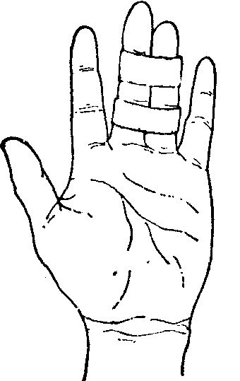 单纯关节扭挫伤可用粘膏保护固定48小时,以后作伸屈活动或做理疗。侧副韧带损伤可用两条粘膏将患指和伤侧相邻的手指固定在一起,保护伤指避免再伤,可早期活动(见图)。侧副韧带部分断裂或撕脱骨折无移位时,可用铝板等固定指间关节于微屈位,约3周后再做功能练习等治疗。侧副韧带全断裂侧方活动明显(开口感)或撕脱骨折片有移位者应手术缝合固定。术后石膏固定两周即可。陈旧的韧带断裂关节不稳时,应手术将韧带近端“U”型切开成一舌状瓣,将它向近端拉紧重叠缝合。制动2~3周以后进行功能练习,效果良好。