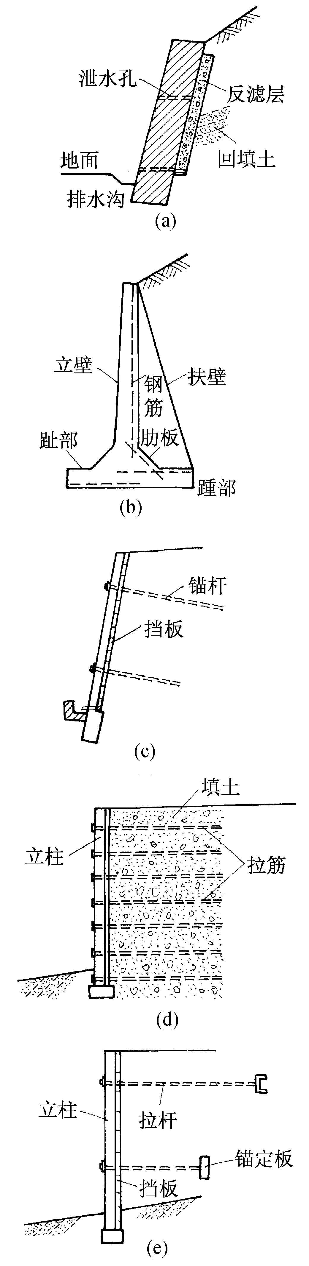 释义 | 挡土墙支承土层压力,防止土坡坍塌的结构物。用于两侧地面有高差的情况。常用砖、石、钢筋混凝土等建成。 挡土墙 挡土墙retaining wall用于支挡陡坡路堤或山体边坡的建筑物。挡土墙的种类甚多,有重力式,悬臂式,锚杆式,加筋土和多层锚定板式等。重力式挡土墙(图a)完全依靠墙体本身的重量来抵抗墙后的土压力以保证其稳定,用片石或混凝土筑成,结构简单,应用极为广泛。但在地基软弱或墙身较高、土压力较大的情况下,不宜修筑。悬臂式挡土墙(图b)由立壁、趾部和踵部三个悬臂组成,用钢筋混凝土筑成。当墙身较高时,沿墙身一定距离上加建一道扶壁和踵部连接形成扶壁式挡土墙。锚杆式挡土墙(图c)的墙面由钢筋混凝土立柱和挡板构成。立柱用锚入稳固地层中的锚杆拉住,立柱间安装挡板。加筋土挡土墙(图d)为20世纪60年代新出现的形式,它依靠拉筋与填土间相互摩擦力使墙身稳定。锚定板式挡土墙(图e)依靠填土中的多层锚定板的抗拔力来保持墙身稳定。后三种形式的结构轻型,适用于机械化施工。 挡土墙 ☚ 护坡 路堤填土压实 ☛ 挡土墙防止土坡坍塌的结构物。例如,路堤、路堑旁的挡土墙、水工建筑物的闸墙、驳岸和房屋地下室的外墙等。主要作用是支承土的侧向压力。常用混凝土、钢筋混凝土、砖或石等筑成。在山地建设营区,挡土墙工程对建设投资影响较大,需根据营区总体规划搞好可行性研究,选择既经济合理,又安全可靠的构筑方案。 |