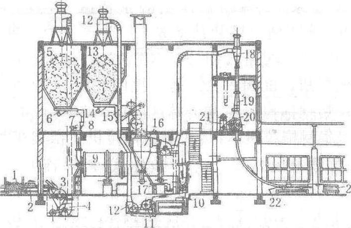 奥卡尔挤压法生产工艺设备图 1.木材废料; 2.皮带运输机; 3.削片机; 4.气流运输设备; 5.料仓; 6.振动出料槽; 7.电磁分离辊; 8.刨片机; 9.刨花干燥机; 10.振动筛选机; 11.锤式再碎机; 12.气流运输设备; 13.干刨花料仓; 14.振动出料槽; 15.拌胶机; 16.料仓; 17.振动出料槽; 18.气流运输设备; 19.冲压棒; 20.奥卡尔挤压机; 21.挤压机 驱动装置; 22.横截锯; 23.板堆 挤压法的主要优点是:耗胶量低,因而生产成本也较低;挤压成型后的带状板坯边缘光洁,无需锯切加工,除横截锯产生少量锯屑外,无其他工艺性废料,因而原料利用率高;成品尺寸公差范围也小,厚度膨胀率极低,有利于家具制造业应用。挤压法用螺旋挤压式行模(简称挤压机)生产预应力混凝土圆孔板的工艺。国外是从60年代开始,中国在70年代中期已推广,挤压机已定型生产。 挤压机是用旋转的螺旋铰刀把由料斗漏下的混凝土拌合物向后挤送,在挤送过程中由于受到已振动成型的混凝土空心板的阻力(反作用力)而被挤压密实,在挤压机后面形成一条连续的混凝土空心板带,而挤压机也在这一反作用力推动下自行前进。挤压机可沿着台座上的导轨行驶,亦可利用预应力钢丝导向,沿钢丝移动。板带的切断有两种方法,一是在混凝土达到可以放松预应力钢丝强度时用切割机切断;二是在混凝土初凝前用灰铲或气割法、水冲法切断。 螺旋铰刀是挤压机的主要部件,其根数取决于板的圆孔数,为避免挤压机行走偏斜,两组螺旋铰刀做相对反向转动,其螺距大小影响对混凝土的挤压力。 挤压法jǐ yā fǎsqueezing and pressingmanipulation |