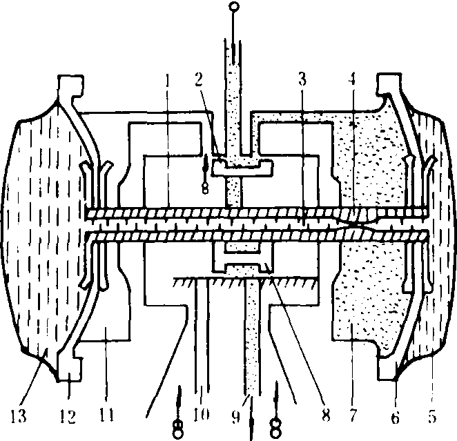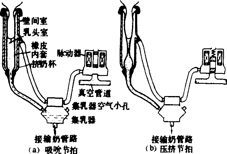 释义 | 挤奶器milker靠真空压力吸取牛奶的器具。是奶牛挤奶设备的基本工作部分。 图1 二节拍挤奶器工作简图 挤奶杯 产生类似于小牛吸奶的动作,使乳头不断受到真空吸吮和挤压,将奶吸出。它由不锈钢制的金属圆筒和橡皮内套组成。内套内部的空间称为乳头室,输入固定的真空压力;内套与金属圆筒之间的环形空间称为脉动室,通入由脉动器供应的脉动真空。内套富有弹性,其两端能将金属圆筒密封,口部大小适宜,使套上乳头时空气不会泄入乳头室。 脉动器 将输入的固定真空转变为真空与大气交替变化的脉动真空,供应挤奶杯的脉动室,以产生不同的工作节拍。脉动器有液气式、气压式、电磁式等三种。液气式脉动器(图2),由器体、上下阀门机构、橡皮膜片和连接两膜片的空心连杆组成。两膜片在器体的左、右形成4个相互隔开的小室:中间两个小室为气室,交替通入真空或大气,由上阀门机构控制;左右端部两个小室,充满液体,通过空心连杆中的节流孔相互沟通。下阀门为脉动真空输出阀,随空心连杆一起运动,并带动上阀门。当连杆处于右侧极端位置时,下阀门使真空通向右输出管道,左输出管道则与大气相通。同时上阀门使右侧气室通入真空,左气室进入大气。膜片在压力差作用下,与空心连杆一起向左侧移动,使左侧端部的小室体积变小,液体通过空心连杆的节流孔流向右侧端部小室,直至上、下阀门移动到左侧位置;此时右输出管道与大气相通,左输出管道输出真空,左右气室也同时发生相反的变化。在反向压力差作用下,膜片带动空心连杆开始向右运动,依次不断重复,使输出管道不断输出脉动真空。膜片往复转换的频率取决于空心连杆中节流孔的大小,它控制液体从一侧小室流向另一侧的速度,节流孔小,膜片移动速度慢,脉动频率低。反之则频率高。液气式脉动器,其液体在密闭系统内流动,不受外界条件影响,工作稳定可靠,但结构复杂。气压式脉动器利用橡皮膜片两边压力差的变化来带动阀门的转换,结构简单,但脉动频率易受环境温度和尘垢堵塞工作沟道的影响。电磁式脉动器是利用电磁线圈电路的通断所产生电磁力的变化,带动阀门转换,工作稳定、可靠,但需由脉动控制器来控制电路的接通和断开,常用在大型管道式挤奶机上。脉动控制器是一电子定时器,能产生具有各种频率的电路通断信号,以控制各挤奶器上的电磁式脉动器。 图2 液气式脉动器工作简图 1.空心连杆;2.上阀门;3.中心孔道;4.节流孔道;5、13.液体室;6、12.橡皮膜;7、11.气室;8.下阀门;9.右脉动真空输出管(供应两个挤奶杯的脉动室);10.左脉动真空输出管(供应另两个挤奶杯的脉动室) 集乳器 由集乳室和脉动分配室组成。脉动分配室将脉动器输出的脉动真空,送到各挤奶杯的脉动室,集乳室将真空泵输出的固定真空送到挤奶杯的乳头室,并汇集挤下的牛奶,输往奶桶或输奶管路。 乳头室内为固定真空。当脉动器向集乳器输出真空时,挤奶杯的脉动室也呈真空状态[图1(a)],橡皮内套内外无压力差,内套张开,乳头在真空作用下,括约肌开放,牛奶被吸出,此过程称吸吮节拍;当脉动器输出大气压力时,挤奶杯的脉动室呈大气压力[图1(b)],橡皮内套在内外压力差作用下向里压挤乳头,使括约肌关闭,奶停止流出,此过程称压挤节拍。依此不断重复,形成二节拍的工作循环。为使汇集在集乳器集乳室内的牛奶能顺利流出,集乳室上方设有直径为0.8毫米的气孔。 挤奶器的真空度高低及其稳定性、脉动频率(每分钟的脉动循环次数)和节拍比(吸吮节拍与压挤节拍所占时间之比)对挤奶作业有重大影响。真空度高能使乳头括约肌开放,加快挤奶速度,但容易引起乳头肿胀,使剩余奶量增加;真空度低会影响乳头括约肌开放,降低挤奶速度;合适的真空度应在挤奶杯内保持44~50千帕。稳定的真空度能提高挤奶效率和防止发生乳房炎。真空室稳定性应以挤奶时挤奶杯不从乳房脱落为度。集乳器堵塞,输奶管路坡度不合适,橡皮内套破损,转移挤奶器,真空贮备不足等都会引起真空度的波动。提高脉动频率和加大节拍比对提高挤奶速度有利,但易引起乳头括约肌的疲劳、肿胀和充血,奶不易挤尽。合适的脉动频率为每分45~70次,节拍比1.5~3.0∶1。根据国际标准推荐:在一脉动周期内,挤奶杯脉动室内正常的工作真空所占时间不应少于30%,大气压力时间不少于15%。 挤奶器用于吸取牛奶的器具。1903年英国首先研制出真空挤奶器。挤奶器由挤奶杯,脉动器和集乳器3部分组成。按挤奶节拍可分为3节拍和2节拍2种类型。适宜的脉动频率为45~70次/min,节拍比为(1.5~3.0)∶1,挤奶杯内应保持44~50 kPa的真空度。1998年中国拥有机动挤奶器1511套。 |