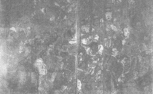 明。纵146厘米,横240厘米。山西省新绛县稷益庙正殿东壁下部壁画。这是表现农民生活的一个生动场面。农夫或扛锄,或持䦆,或赤手,纷纷涌向一处。画面中央几位农夫在捆缚一只蝗虫精。蝗虫精长二尺许,绿身,褐翅,尖爪,目圆睁,口大张而露齿,虽被擒仍在做最后挣扎。作者以现实生活为依据,选取农业中经常碰到的蝗虫灾害作为绘画题材,但又未照搬生活直接表现农夫与群蝗的斗争,而是大胆地做了艺术夸张,将这种捉小小蝗虫的场面,通过捉住一个臆造的蝗虫精加以浓缩,充分显示出作者高度的想像力和概括力。作者对农夫的形象表现逼真,那风吹日晒而形成的古铜色肌肤、深深的皱纹、粗壮的身材、愤恨的表情,都是作者深入观察生活、技艺高超的体现。