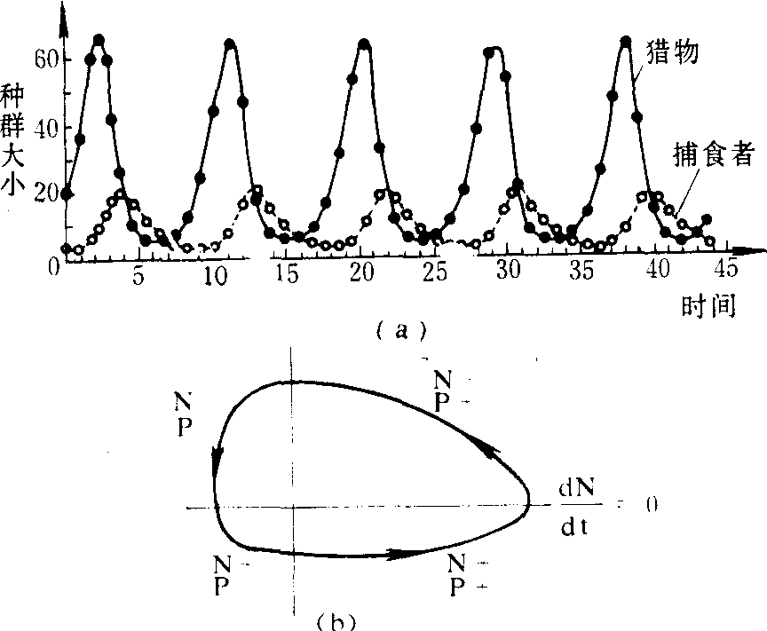 释义 | 捕食者—猎物模型predator-prey models又称寄生物—寄主模型,是表达捕食者—猎物系统内种群数量变化动态的数学方程。可为昆虫种群动态和害虫生物防治提供数量信息。影响捕食者—猎物种群动态的因素复杂多样,如捕食者有寻找效应、选择效应、扩散聚集效应、饥饱水平、种内和种间相互干扰效应等;猎物有逃避作用、饱和作用等;捕食者和猎物种群各自包含有对环境因素的适应,种内种间竞争作用,以及种群自身的调节作用等。因此,相应的数学模型也多种多样。如对世代重叠的昆虫类型常采用微分方程表述其连续状态,最早由美国洛特卡(A. J. Lotka,1925)、沃特拉(U. Volterra,1926)提出:如对世代不重叠的昆虫类型多采用差分方程表达其离散状态,最早由英国尼可尔森(A. J.Nicholson,1933)提出。 式中 N、P为猎物、捕食者种群;γ为猎物增长率;b为捕食者单独存在时的增长率;α、β分别为攻击、防御系数;rN项表猎物(N)呈指数增长,“功能反应”项(αNP)表捕食者对猎物种群影响的效果,捕食者种群(P)具有内禀死亡率项(—bP),和取决于猎物密度的增长率项(βNP),此项即“数值反应”项。这一模型揭示了捕食者—猎物系统有产生周期性振荡的倾向,周期取决于该模型的参数(α、β、γ、b),而振幅大小取决于捕食者和猎物的初始密度(图1a)。如将上图的结果以捕食者密度作纵坐标,猎物密度作横坐标,按时间顺序作出相位图,就可得到一个封闭环,并可想象通过平衡点(N=25、P=10)作两条互相垂直的线,形成坐标图(图1b)。封闭环的轨道表示:在垂直线右面捕食者种群增加,在左面减少;在水平线下面,猎物种群增加,在上面减少。故捕食者和猎物种群动态可分4个相位:❶猎物增加,捕食者减少; ❷猎物和捕食者都增加; ❸猎物减少,捕食者增加; ❹猎物和捕食者都减少,亦即随时间的改变,捕食者和猎物密度呈相互消长的关系。