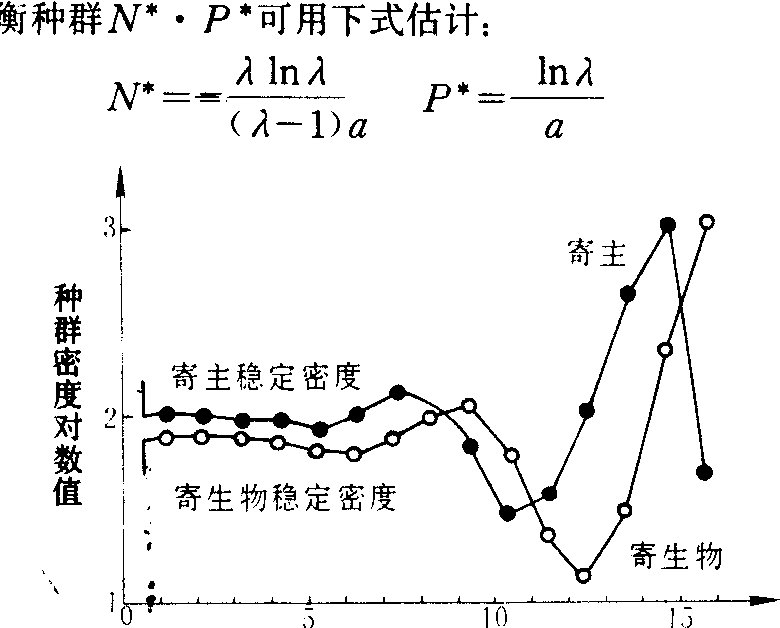 (仿G. C. Varley等) 哈塞尔模型 由哈塞尔(M. P. Hassell,1976)提出的模型,考虑了捕食者的食欲(寄生物的产卵量)有上限,对猎物的寻找时间与猎物密度有关。将α看作瞬间的猎物发现率 (α′) 与寻找时间(Ts)的乘积:α= α′ Ts。由于寻找时间与捕食者对猎物的处置时间(Th)有关,即Ts=T-ThNa,T为可供捕食者用于寻找的总时间,则猎物被捕食的数量为 假设: ❶寻找是随机的。 ❷捕食者之间无相互干扰作用。 ❸捕食者的捕食作用随猎物密度上升而攻击率下降,则哈塞尔方程为: 哈塞尔三物种模型 哈塞尔(M. P. Hassell,1976)关于两种猎物与一种捕食者系统的作用模型,考虑了两个猎物种群之间竞争,捕食者对两个猎物的选择效应,以及捕食者的攻击效应。其方程为: 式中 N1(t),N2(t),P(t)分别表示t时猎物1、猎物2与捕食者种群数量;γ1,γ2,K1,K2分别表示猎物1与猎物2的内禀增长率与饱和量,上式中〔γ-(γ/K)〕项说明N1、N 种猎物种群均呈S型生长,而[N1(t)+aN2(t)]或[N2(t)+βN1(t)]项为两种猎物种群之间的竞争信息,f1(Pt)或f2(Pt)项为捕食者对两种猎物种群的作用。 |