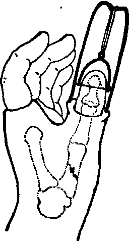 ❷指骨牵引法: 如小夹板固定仍不稳定时,可用拇指末节指骨牵引方法防止移位。牵引方法与掌骨基底骨折同。