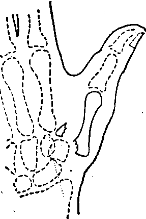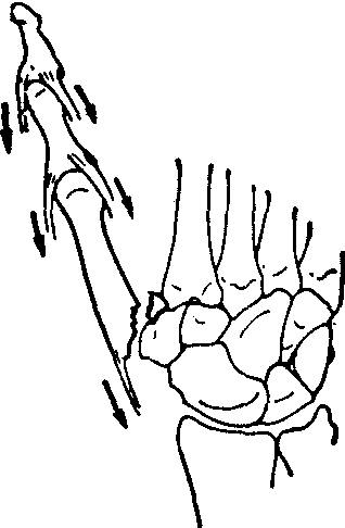 (2) 第一掌骨基底部骨折并脱位。为间接暴力所致,跌倒或被重物碰撞,作用于拇指纵轴上的暴力传导至基底部,而呈斜骨折,骨折线通过腕掌关节,在基底部尺侧形成三角形骨折块,因有掌侧韧带相连,多无移位,而骨折远端被拇长展肌牵拉而向桡侧、背侧脱位,并向桡侧、背侧成角移位。