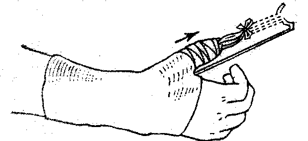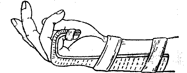 牵引: 用短臂管型石膏将拇指固定于外展、对掌位。在石膏上包一粗铁丝。拇指两侧粘一条2×10cm的胶布,或纱布两条用胶布固定于拇指两侧,外加环行胶布固定,将指端的胶布或布带用橡皮筋数条连于石膏上的铁丝钩上作持续牵引4周 (见图2)。