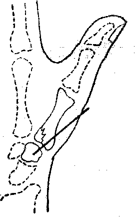 (3)掌骨基底骨折脱位: 又名Bennett骨折。由间接暴力引起,骨折线由掌骨基底内上方斜向外下方而进入腕掌关节内,掌骨基底内侧形成一个三角形骨块。此骨块由于有掌侧韧带相连,仍保持在原位,而骨折远段滑向外侧及背侧,同时因拇长展肌的牵拉和拇屈肌的收缩,造成腕掌关节脱位和掌屈。X线片可明确诊断。手法整复容易,但不稳定甚易脱位。治疗方法有: