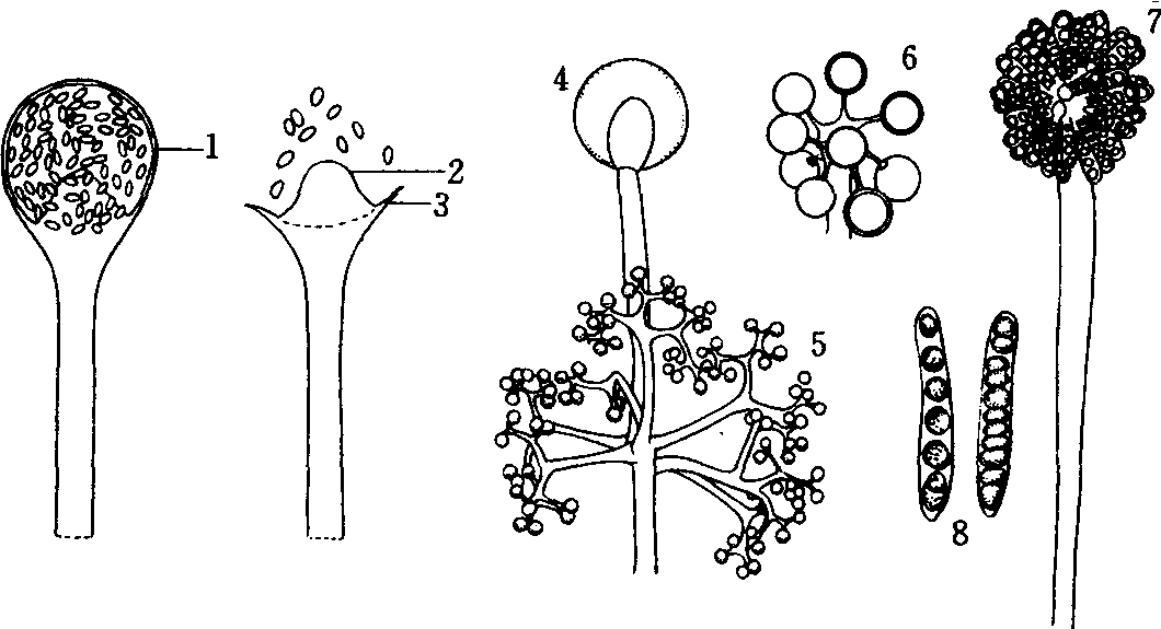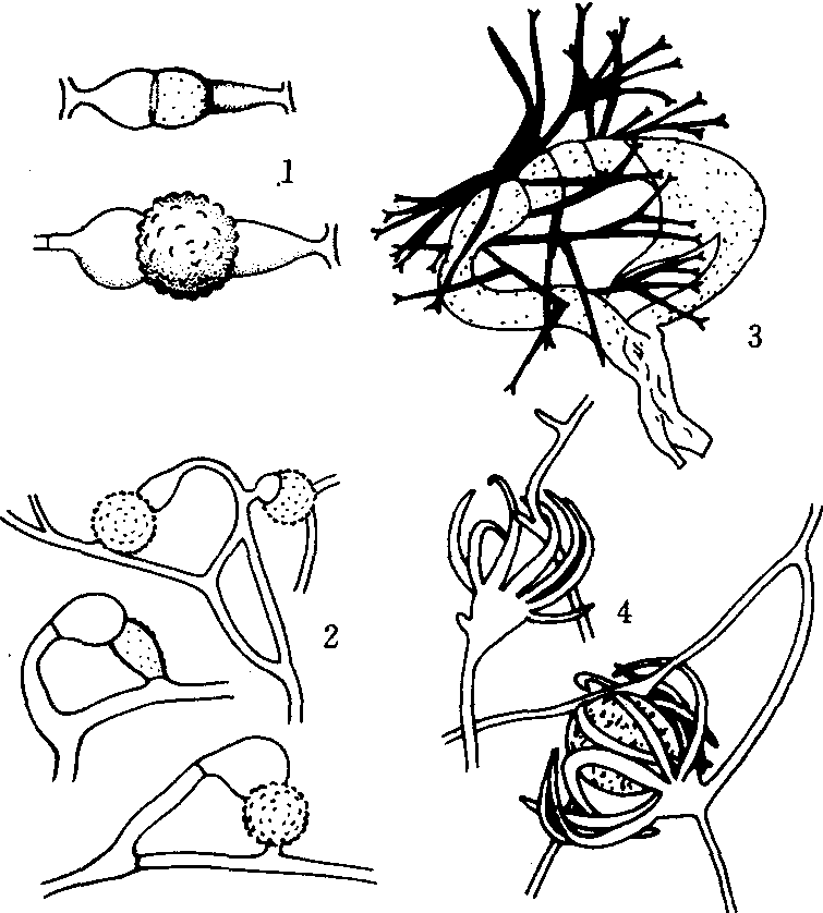接合菌纲(Zygomycetes) 有较发达的菌丝或虫菌体,菌丝大多无隔多核,少数在幼嫩时形成隔膜。无性繁殖产生孢子囊,内含一个或多个不能动的孢囊孢子,有的形成厚垣孢子或芽孢。有性生殖产生接合孢子。多数腐生,有些寄生于真菌、植物、动物和人类。有115属665种。能引起植物病害的只有毛霉目的几种真菌。接合菌纲分为6个目:❶内囊霉目(Endo-gonales)。形成球形或不规则形子实体,内含无囊轴的孢子囊、接合孢子、单性接合孢子或厚垣孢子。常见的有高等植物的菌根菌。 ❷梳霉目(Kickxellales)。菌丝有隔膜,隔膜中央堵塞; 无性态为具单个孢子的孢子囊,生于孢囊梗顶部梳状排列的瓶形小梗上。 ❸双珠霉目(Dimargaritales)。菌丝有隔膜; 无性态为柱孢子囊,内含2个孢子。 ❹毛霉目(Mucorales)。菌丝无隔膜,老熟时形成不规则的隔膜,隔膜中央不堵塞; 孢子囊内有多个孢子,有的形成含少数孢子的小型孢子囊或具单个孢子的小孢子囊。 ❺虫霉目(Entomophthorales)。无性繁殖主要产生与分生孢子功能相似的小型孢子囊,能强力射散。大多寄生昆虫。 ❻捕虫霉目(Zoopagales)。无性繁殖主要产生与分生孢子功能相似的小型孢子囊,不能强力射散。多寄生于变形虫、根足虫、线虫等微小动物。 毛菌纲 菌丝较简单,无隔多核不分枝,或分枝有隔。菌体以固着器或吸盘附着于寄主组织上。无性繁殖产生毛孢子、孢囊孢子、节孢子或变形虫状孢子。有性生殖产生接合孢子。是附生于节肢动物内脏或外骨骼上的专性寄生菌。其寄主分布很广,有海洋、淡水和陆生节肢动物,最普通的是昆虫、甲壳动物和千足虫。在利克特瓦得(Robert W.Lichtwardt)1986年发表的专著“The Trichomycetes Fungal Associates ofArthropods”中毛菌纲分为4目,约30属100种。❶外毛菌目(Eccrinales)。菌体不分枝或仅在基部分枝; 孢囊孢子常单生在一列顶生孢子囊内; 未见接合孢子。 ❷内毛菌目(Asellariales)。菌丝具分枝和隔膜; 无性阶段以节孢子繁殖; 有性阶段不明。 ❸变形毛菌目(Amoebidiales)。菌体不分枝,整个菌体如同孢子囊,在某一阶段产生变形虫状细胞; 未见有性阶段。 ❹钩毛菌目(Harpellales)。菌体单一或分枝; 毛孢子外生,常有一根或数根细长附属丝; 许多属产生接合孢子。 接合菌亚门Zygomycotina菌丝无隔多核,有性繁殖产生接合孢子,无性繁殖产生不游动孢子的真菌,包括传统分类中无鞭毛的藻状菌和附生于节肢动物等消化道或体表的毛菌纲真菌。接合菌已明显地由水生发展到陆生; 由游动的孢囊孢子发展为不游动的孢子或分生孢子。 接合孢子类型 接合菌亚门根据菌体的发达程度、生活习性、无性繁殖体的形成方式及类型、寄主等进行分类,分为两纲: ❶接合菌纲(Zygomycetes),从纯腐生到专性寄生的类型均有,大多数是腐生于土壤、粪及其他有机物上,有些则能侵染人、动物、植物和其他真菌。不少种类能引起粮食霉烂、分泌真菌毒素危害人畜; 有些则是酿造、生产胡萝卜素等工业上有用的菌种。其中虫霉属(Entomophthora)、真菌在害虫的生物防治上具有重要作用。无性繁殖产生孢子囊或分生孢子,孢子囊内含有多个或几个,甚至只有一个不动的孢囊孢子。 ❷毛菌纲(Trichomycetes),附生于节肢动物内脏或外骨骼上的专性附生菌。寄主有广泛的地理分布,寄主有海洋、淡水和陆生的节肢动物,最普通的种类寄生在昆虫、甲壳动物及千足虫上。毛菌与寄主的关系目前尚难肯定,有时被认为是共栖关系,菌体简单、无隔多核、不分枝或分枝有隔。菌体以固着器或特殊的吸盘较牢固地与寄主相连。细胞壁为几丁质(如钩孢毛菌目 Harpellales) 或纤维素(如外毛菌目Eccri-nales)。无性繁殖产生4种孢子: 毛孢子、孢囊孢子、节孢子和变形细胞。有性繁殖产生接合孢子,为双锥形。本纲真菌的分类地位还有争议,唯因产生孢囊孢子和有性生殖产生接合孢子而被纳入接合菌亚门。 接合菌亚门Zygomycotina有性生殖产生接合孢子的一类真菌。下设接合菌纲(Zygomycetes)和毛菌纲(Tri-chomycetes) 。营养体为菌丝体,多数无隔多核,有的菌丝分化成有吸收营养或固着作用的特殊结构,如假根、吸器等。无性繁殖产生无鞭毛不能游动的孢囊孢子;有性繁殖为同型或异型配子囊结合产生接合孢子,同宗或异宗配合。本亚门的菌多为腐生,少数寄生于人体、动物、植物或其他真菌上。有些昆虫寄生菌可用于生物防治。腐生性寄生菌有些可引起粮食霉烂,也有些种类用于酿造业。 |