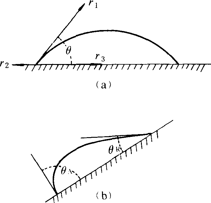 释义 | 接触角contact angle液滴在物体表面上所形成的半球形液面与物体表面之间的夹角。通常用通过球面周边某一观察点的半球截面上的切线对于物体表面的夹角(θ)来表示(图1a)。测定药液在植物叶片或昆虫体表面上的接触角,可借以判断药液的沾附能力,并作为选择适用助剂的依据。 图1 接触角 (据D.R.Johnstone,1973) 形成原理 液滴同物体表面接触后,形成液/固/气三相交接体系。在此体系中形成3种力的平衡: γ1、γ2、γ3。γ1是液滴的表面张力(或液体与气体之间的界面张力),γ2是固体与气体之间的界面张力,γ3是固体与液体之间的界面张力。γ1与γ3的合力使液滴产生收缩力,从而使液滴的接触角趋于增大,而γ2则使液滴容易在固体表面上展开而形成较小的接触角。当药液的表面张力小而与物体表面的亲和力较大时,则药液容易在物体表面上发生湿润和展开,使接触角变小。在γ2与γ1、γ3的合力平衡时,接触角便确定,即 种类 有前进角与后退角两种。❶前进接触角(或推进接触角,advancing contact angle,θA)。把药液滴加到物体表面上时所形成的接触角,或物体表面发生倾斜时液滴流动,在液滴流动的前沿所形成的接触角(图1b)。 ❷后退接触角(或退缩接触角,recedingcontact angle,θR)。把已沉积在表面上的液滴吸去一部分,液滴的周边退缩后所形成的接触角,或物体表面发生倾斜时液滴流动后,在后缘部所形成的接触角(图1b)。前进接触角可用于表达药液的展开能力并用以计算展开系数;后退接触角用于表达药液的润湿能力。此外,因为植物体或昆虫体的任何部分都没有绝对的水平面,研究液滴的前进接触角和后退接触角对于液滴的持留能力和稳定性可提供分析依据。一种不湿润的液体其前进接触角和后退接触角均很大,因此在表面上处于不稳定状态而很容易发生滚落。在表1中的(θA-θR)差值越小即表示液滴越不稳定。 表1 液体在不同表面上的接触角